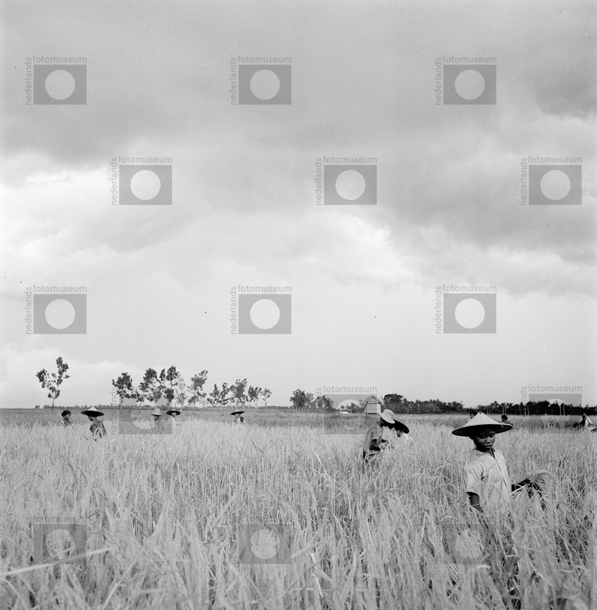 Landarbeiders halen de oogst binnen op een rijstveld...