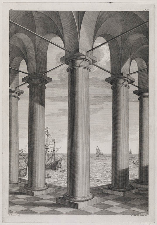 Zicht op zee met schepen, vanonder een zuilengalerij