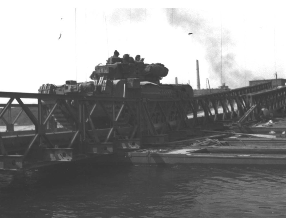 Canadese voertuigen op brugweg (april 1945). WOII.