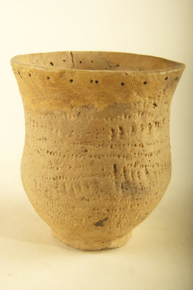 Wikkeldraadbeker van handgevormd aardewerk met versi...