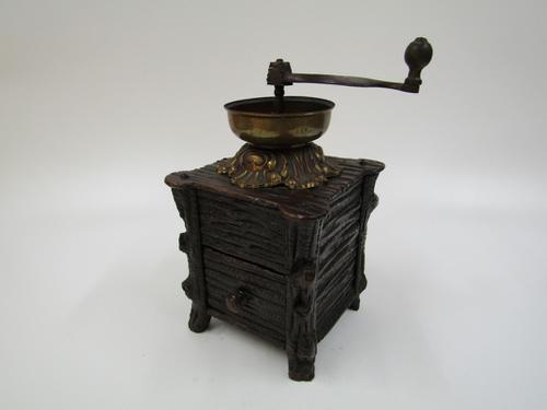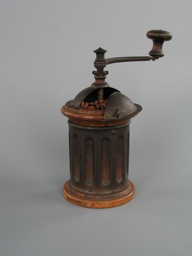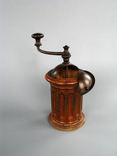 Uit notenhout gesneden tafelkoffiemolen, met messing...