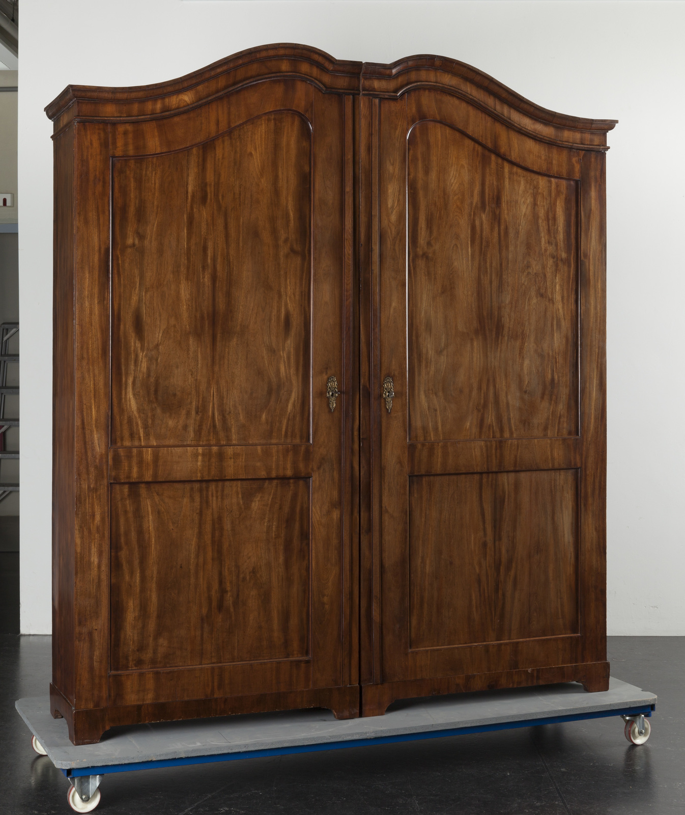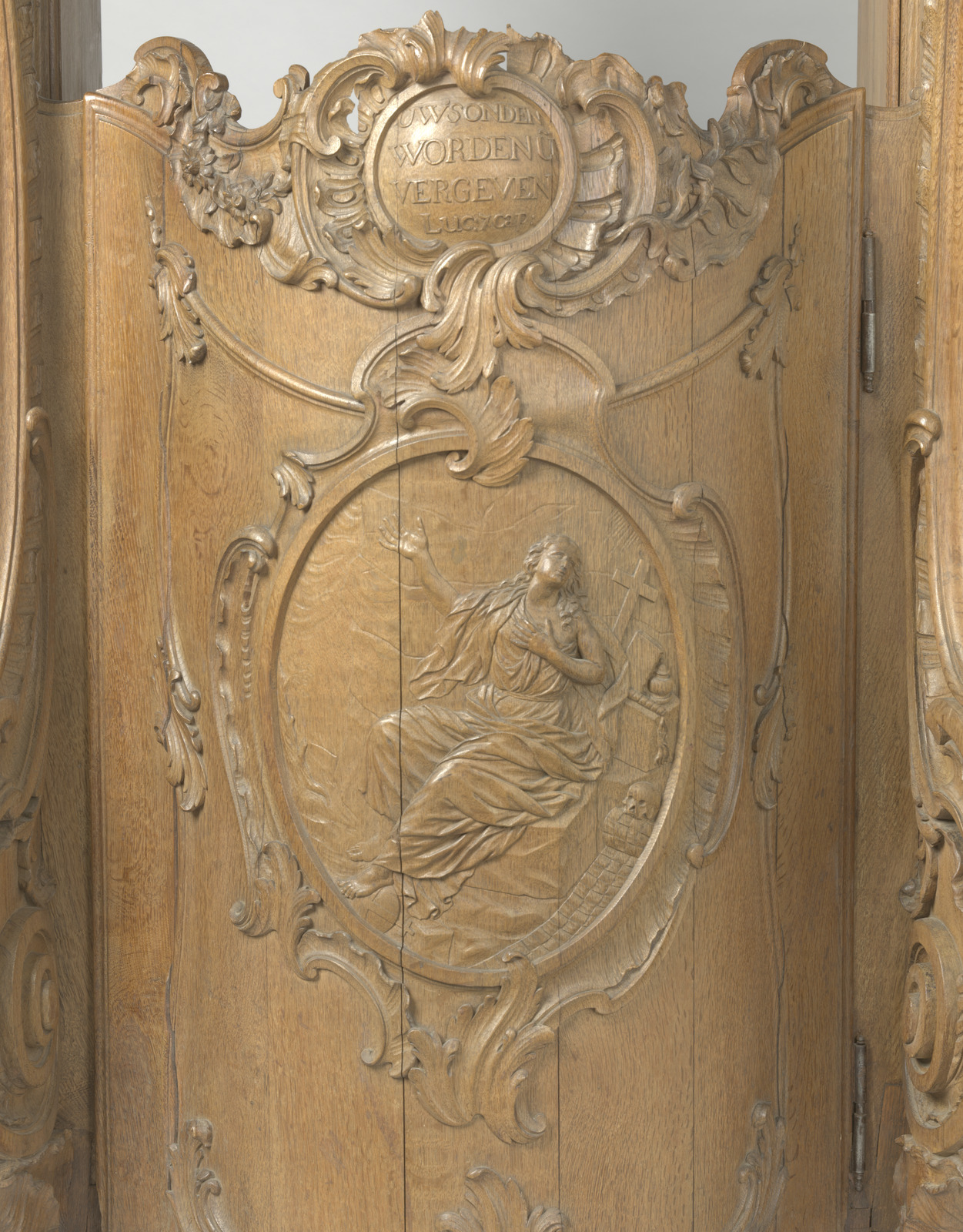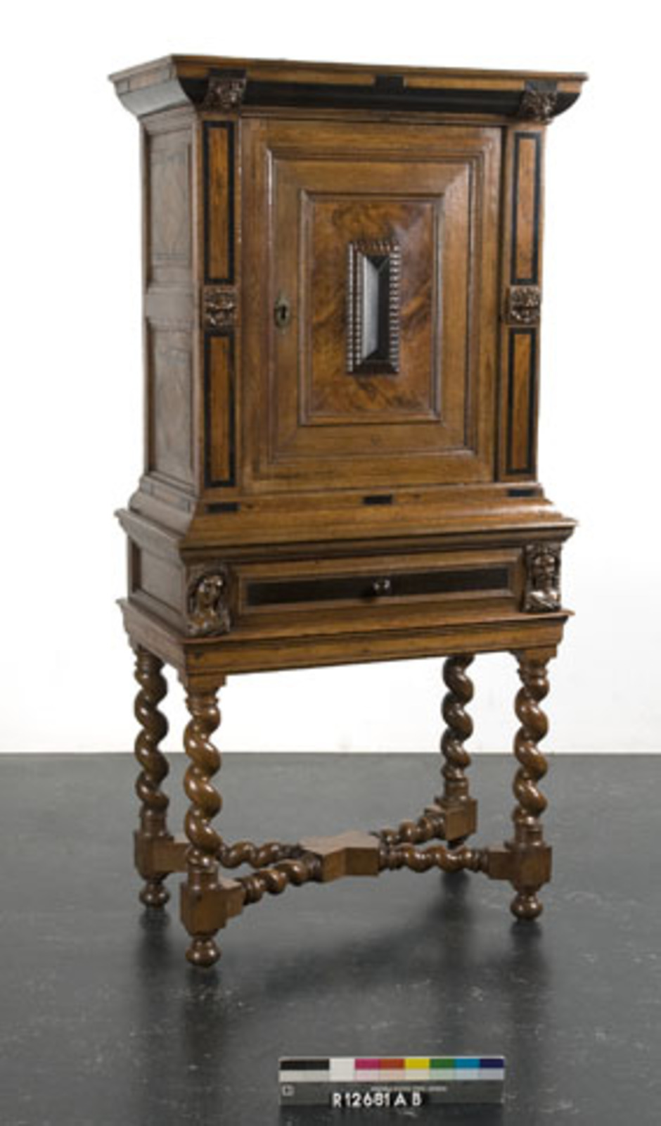 diverse houtsoorten belijmd met padoek- en cederhout, versierd met beschilderde wit marmeren plaquettes (1)