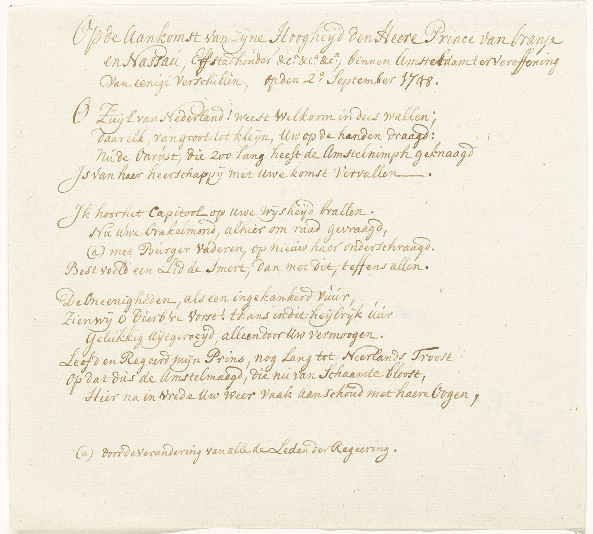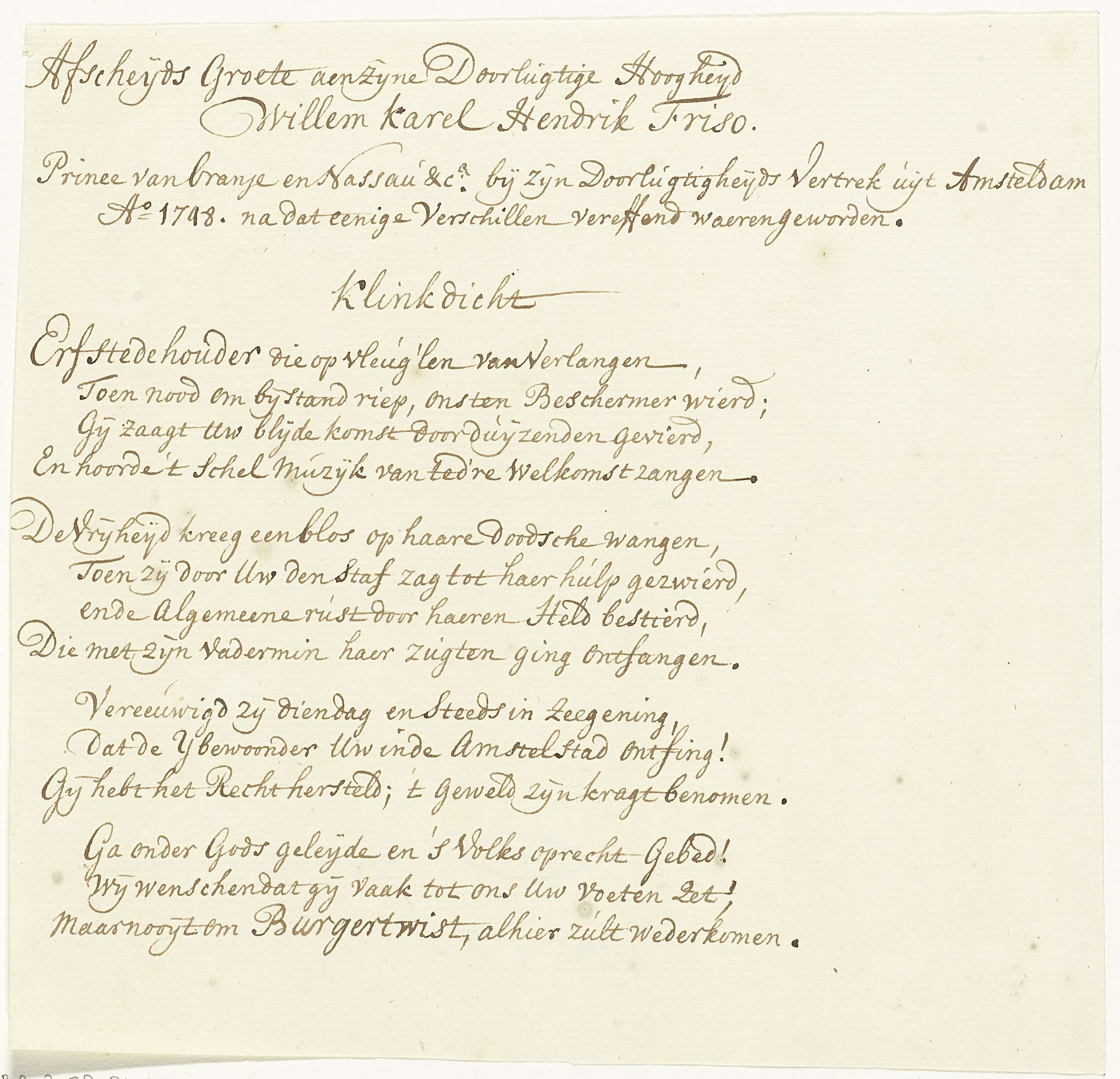Vers op het vertrek van Willem IV uit Amsterdam, 1748