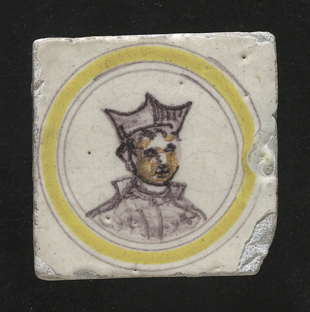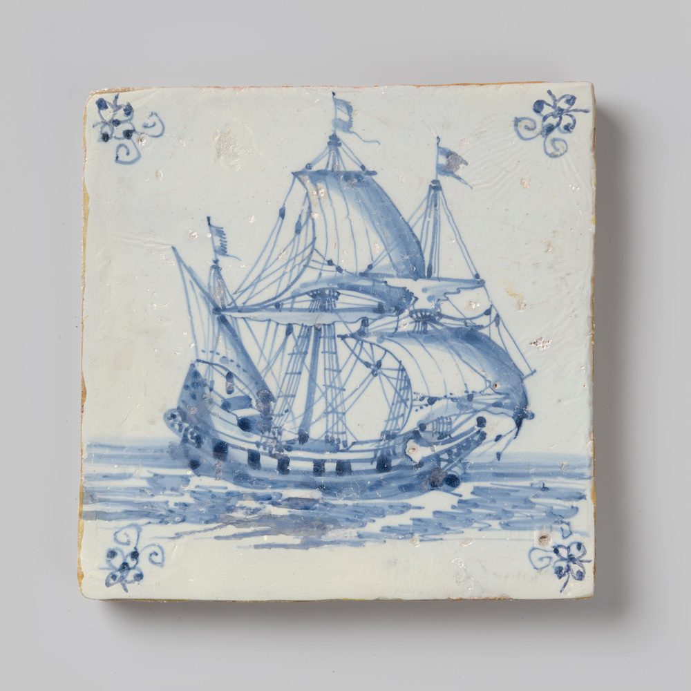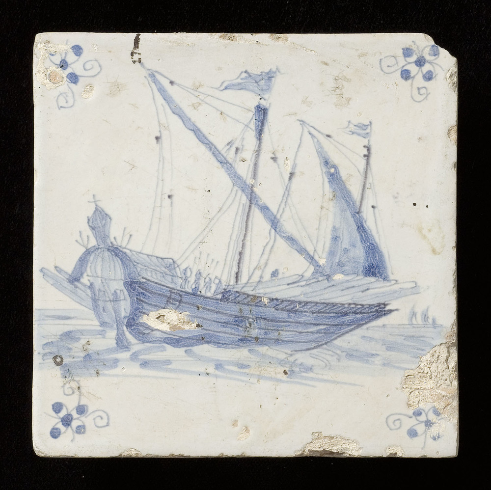 Tegel in tinglazuur, met voorstelling: Schip, ca. 16...