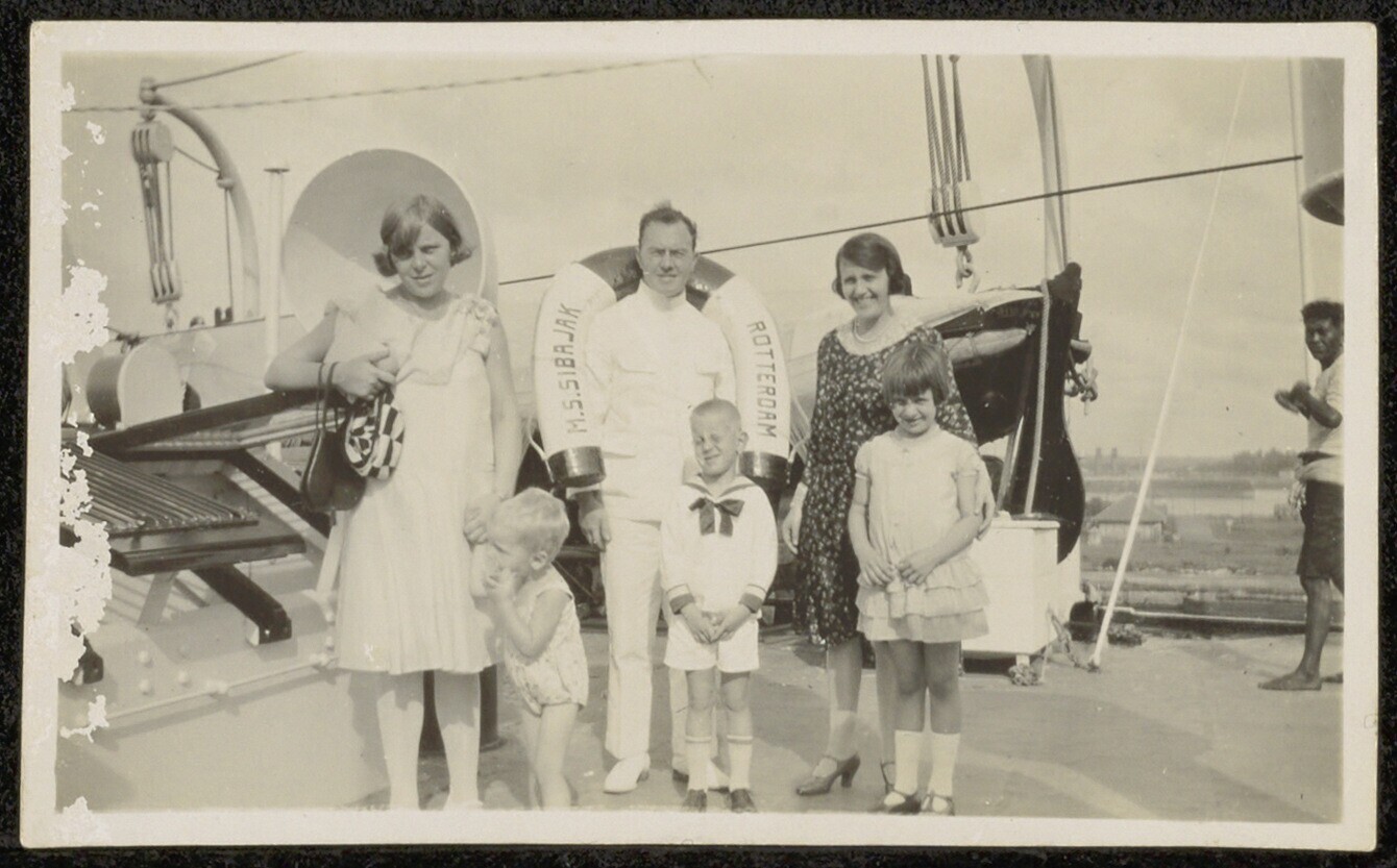 Een Europese man, vrouw en kinderen op het m.s. Sibajak