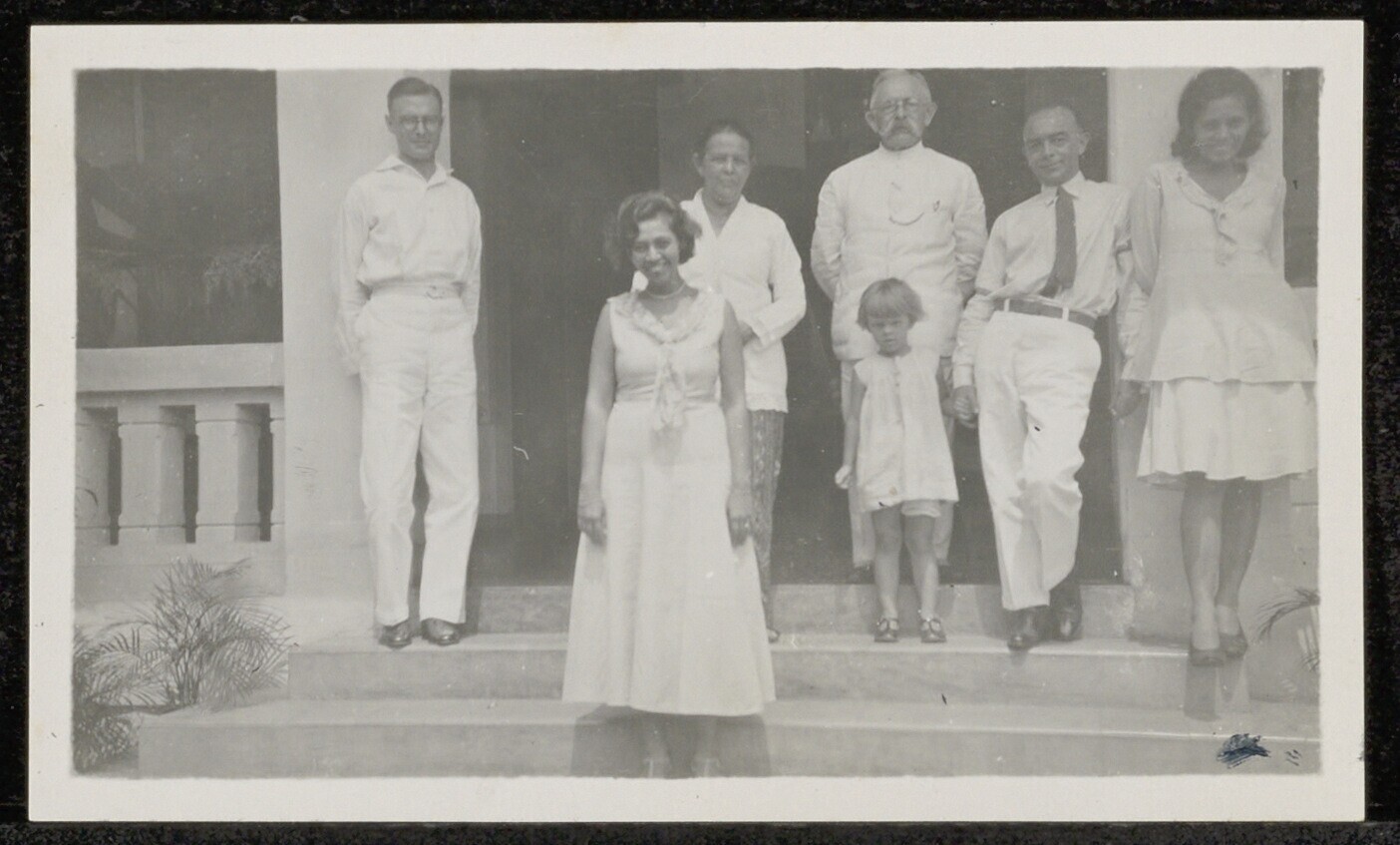 Groepsportret op een stenen trapje bij een veranda i...