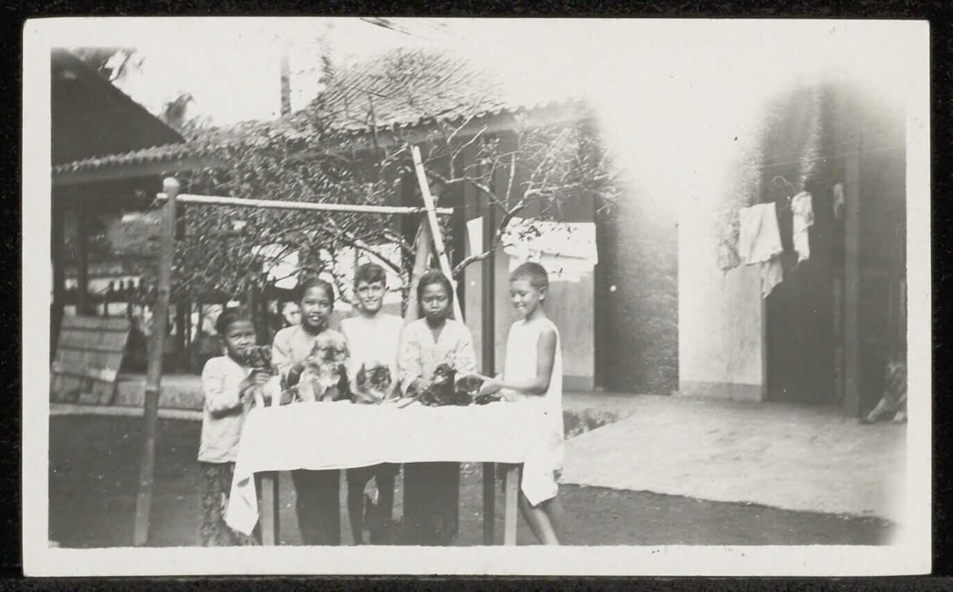 Portret van een groepje kinderen met een aantal hond...