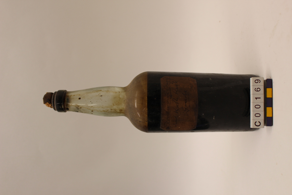 Fles met kurk met vloeibare inhoud met op etiket de ...