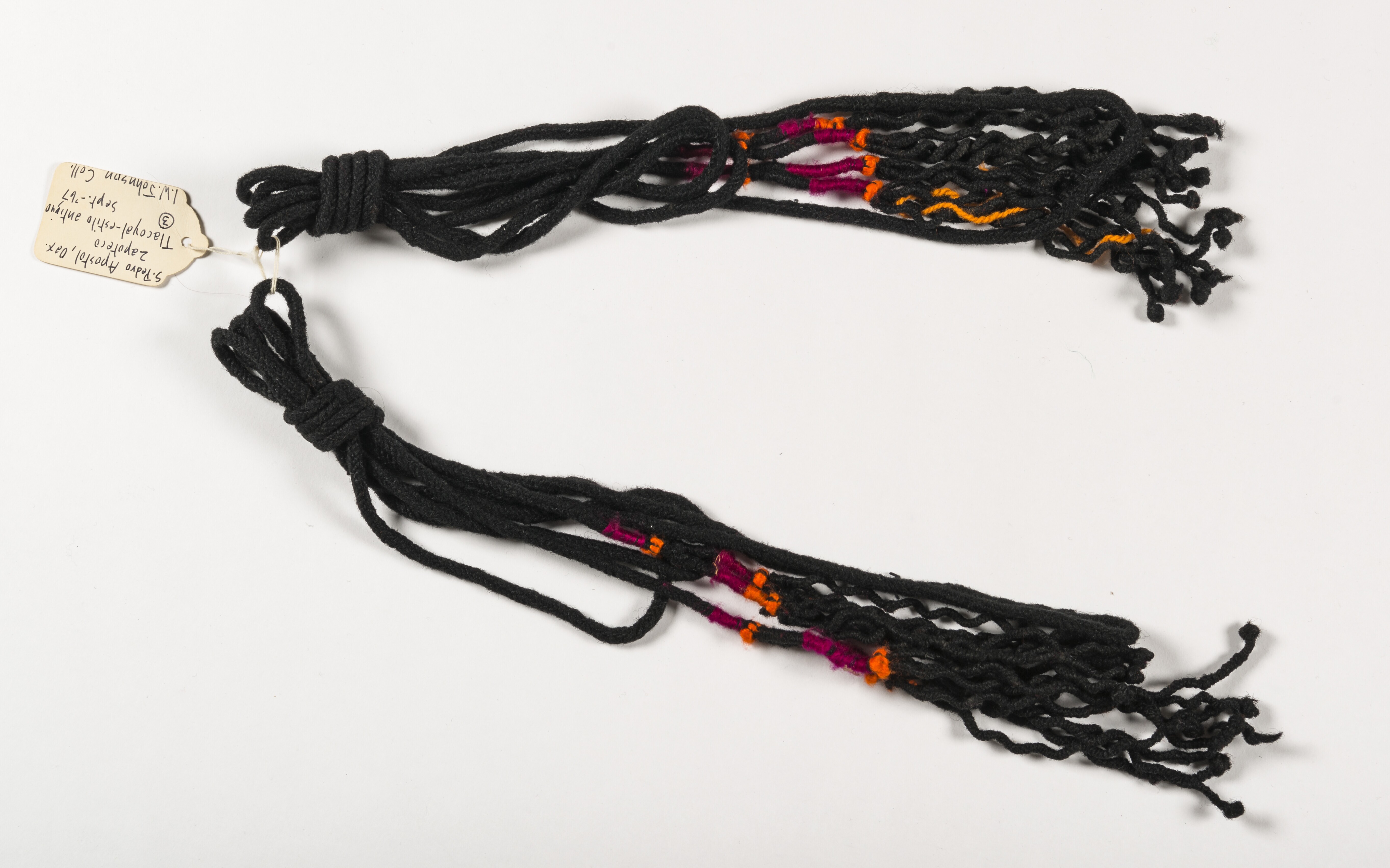 Gevlochten tas versierd met jobstranen, veren en tou...