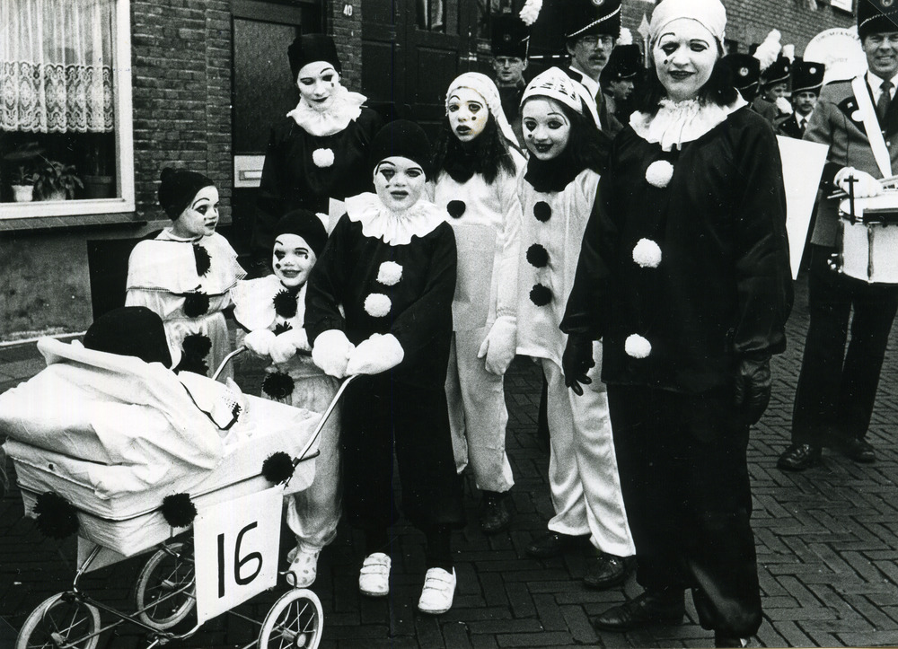 Zwart-wit foto van een carnavalsoptocht te Lobith op...