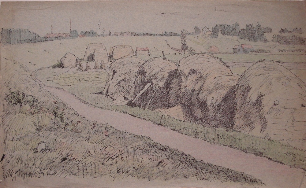 tekening in kleur op papier "Dijk naar Oensel" 1952