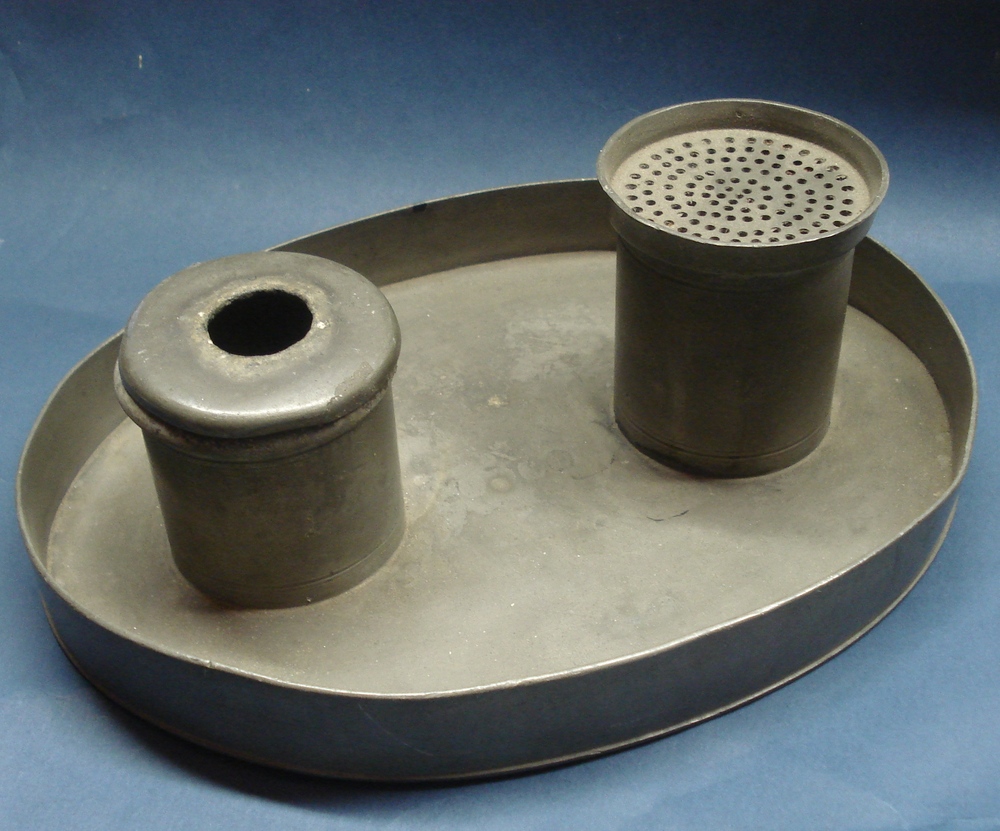 inktstel. Ovaal blad met opstaande rand en twee cyli...