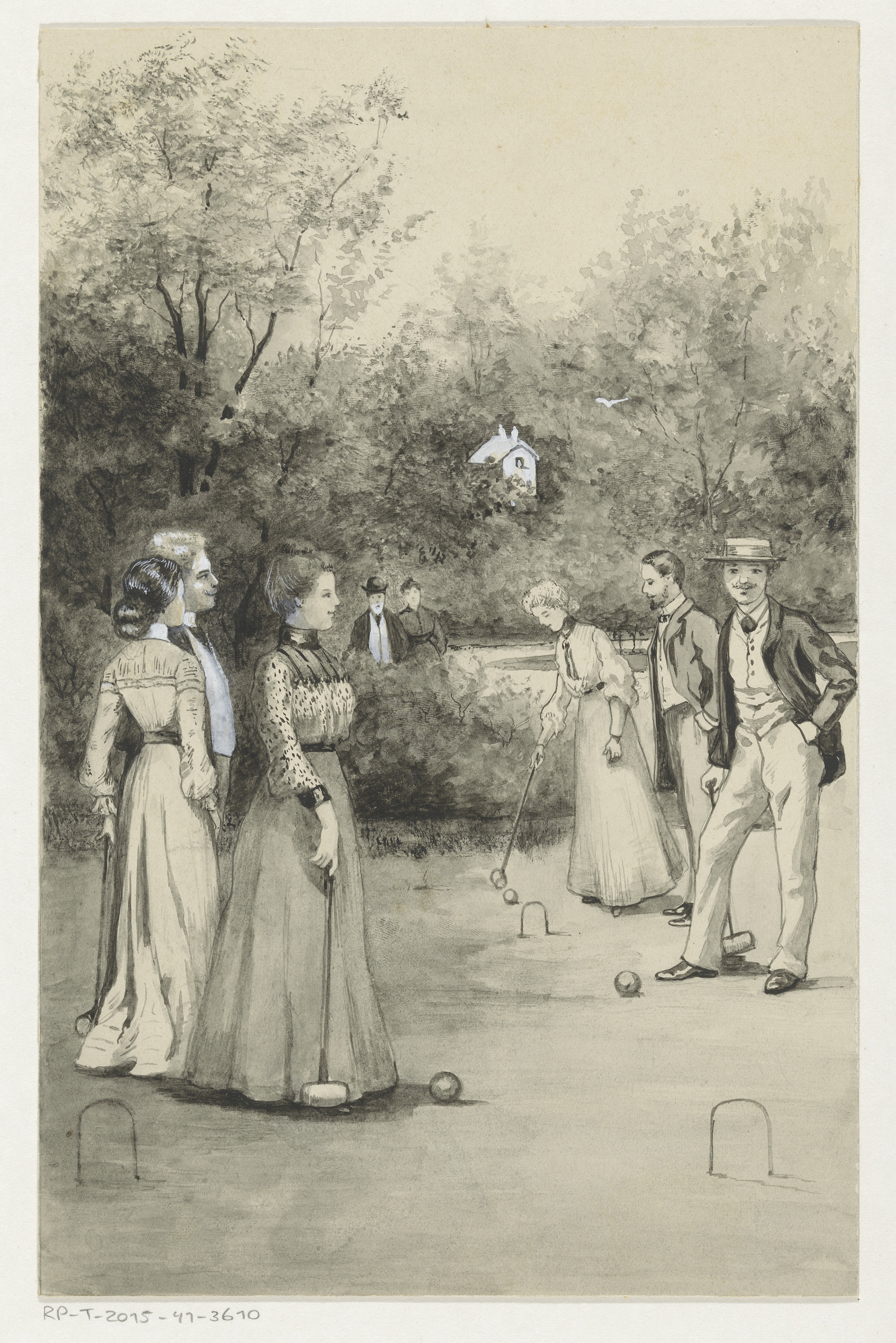 Mannen en vrouwen spelen croquet