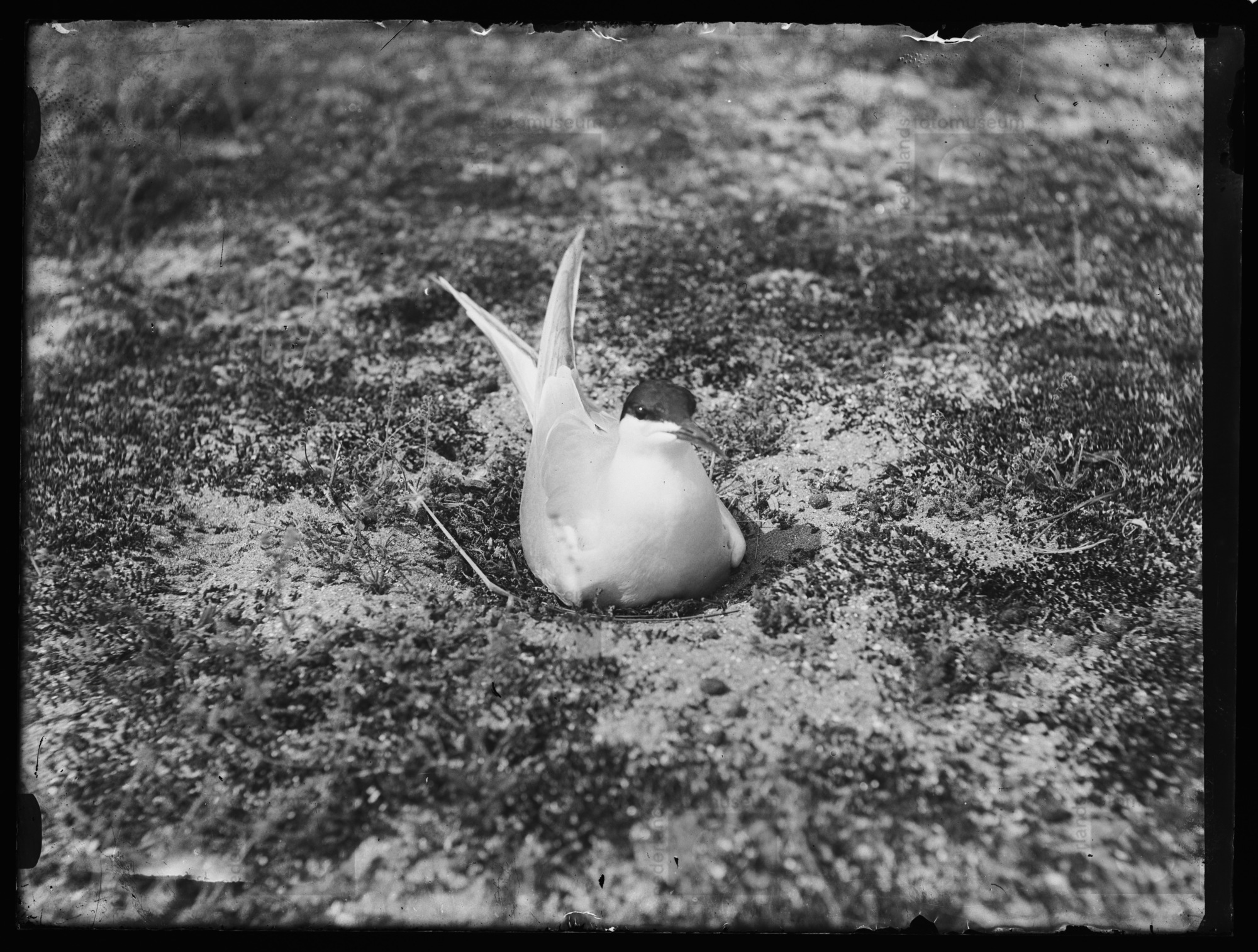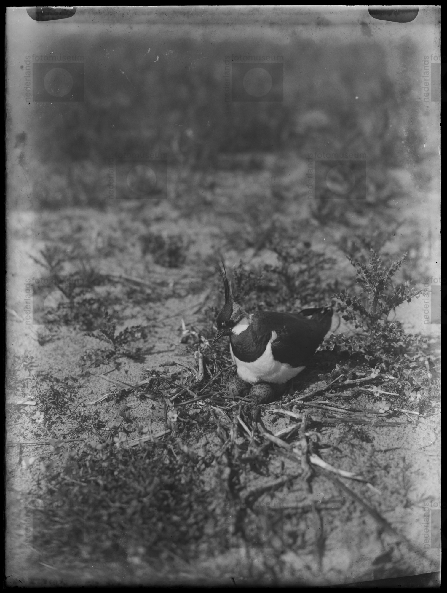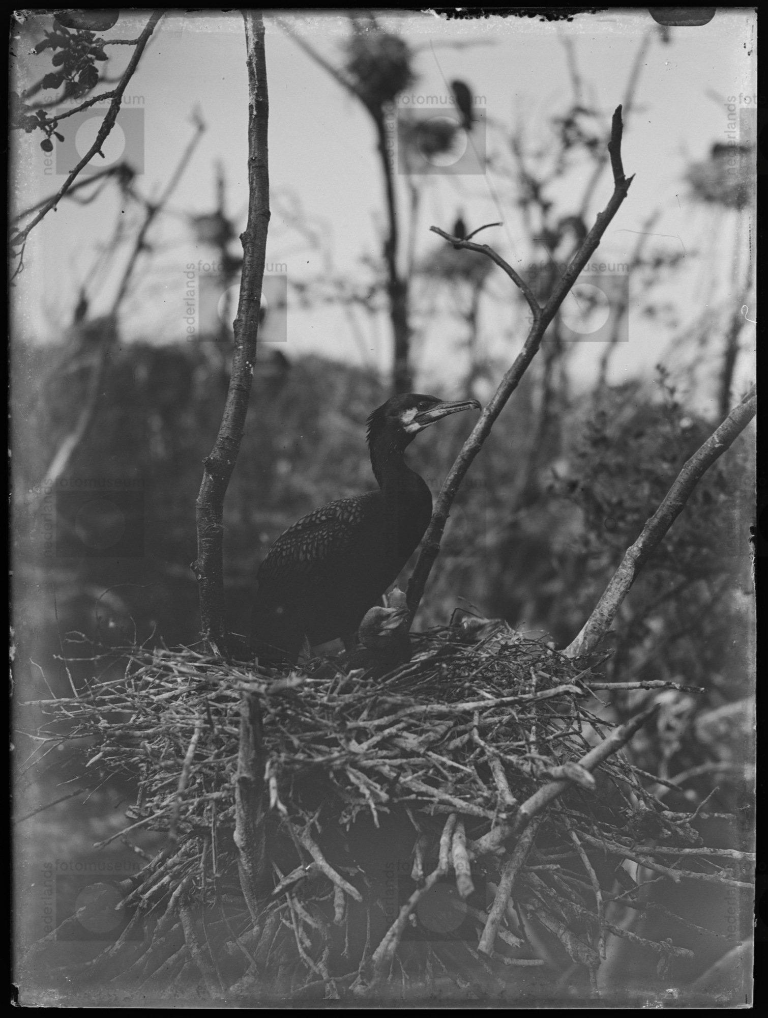 Stormmeeuw op boomnest met jongen, Bergen (1934)