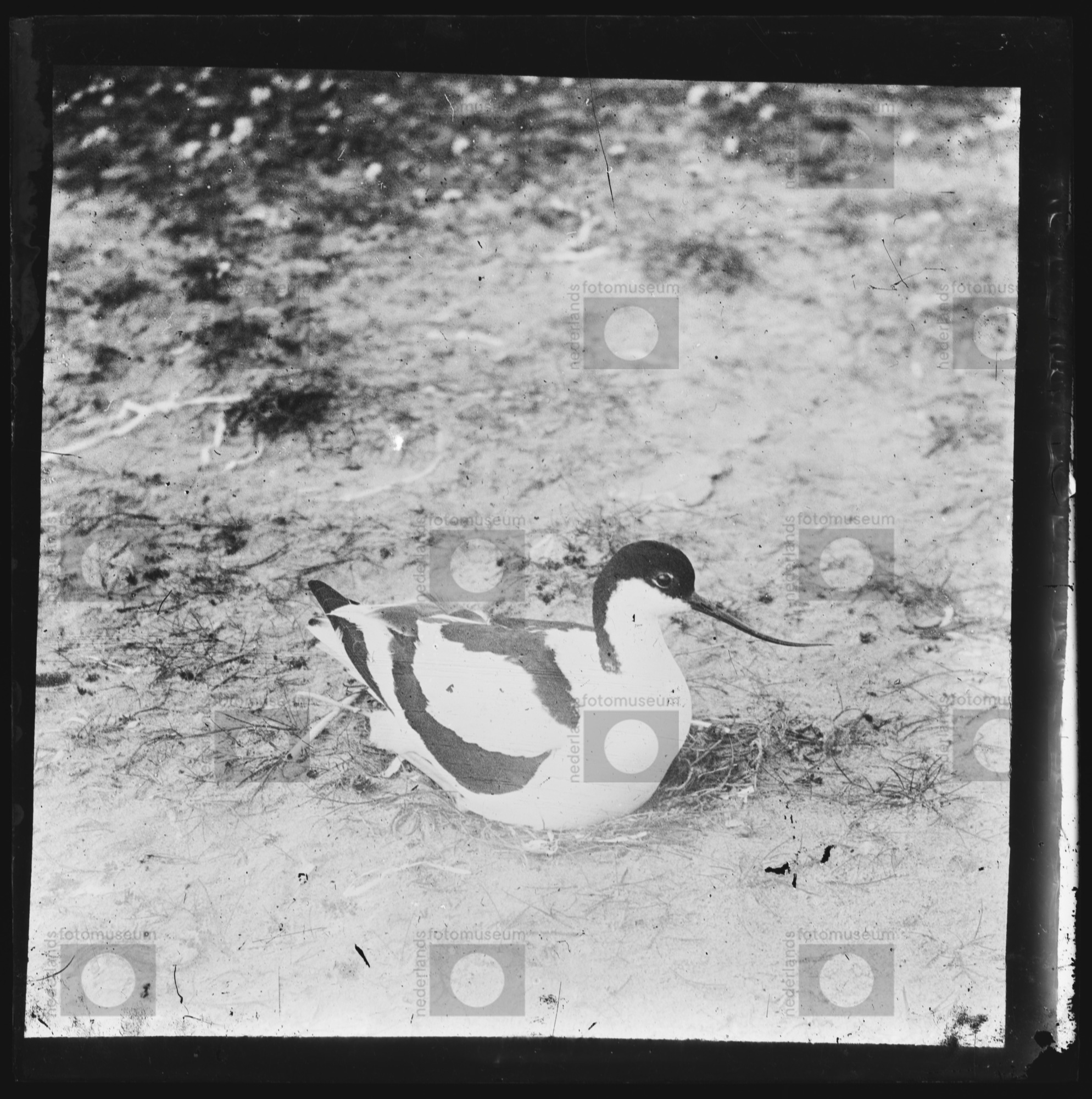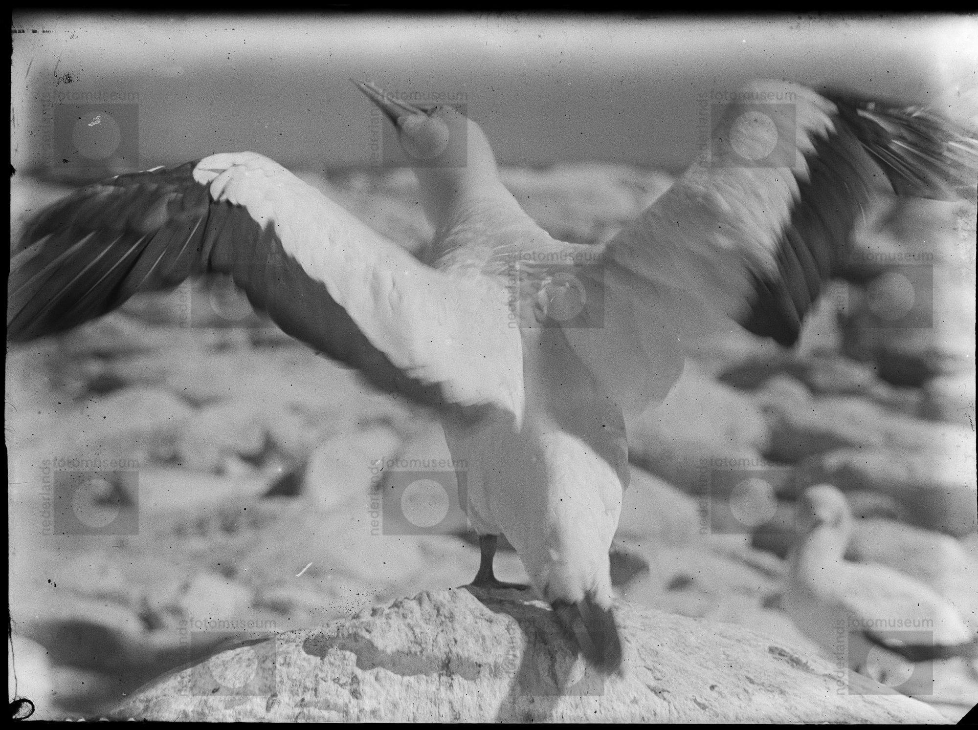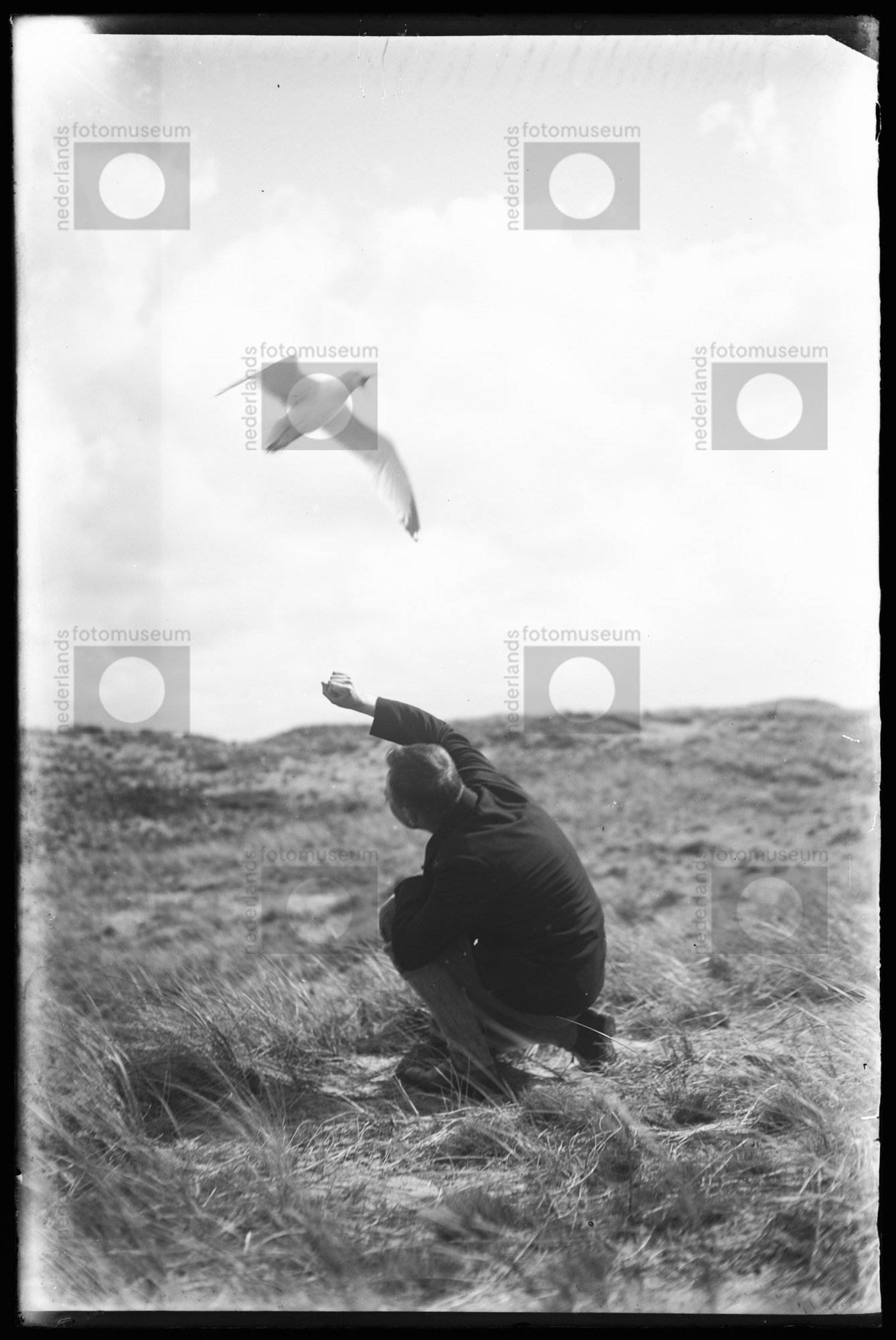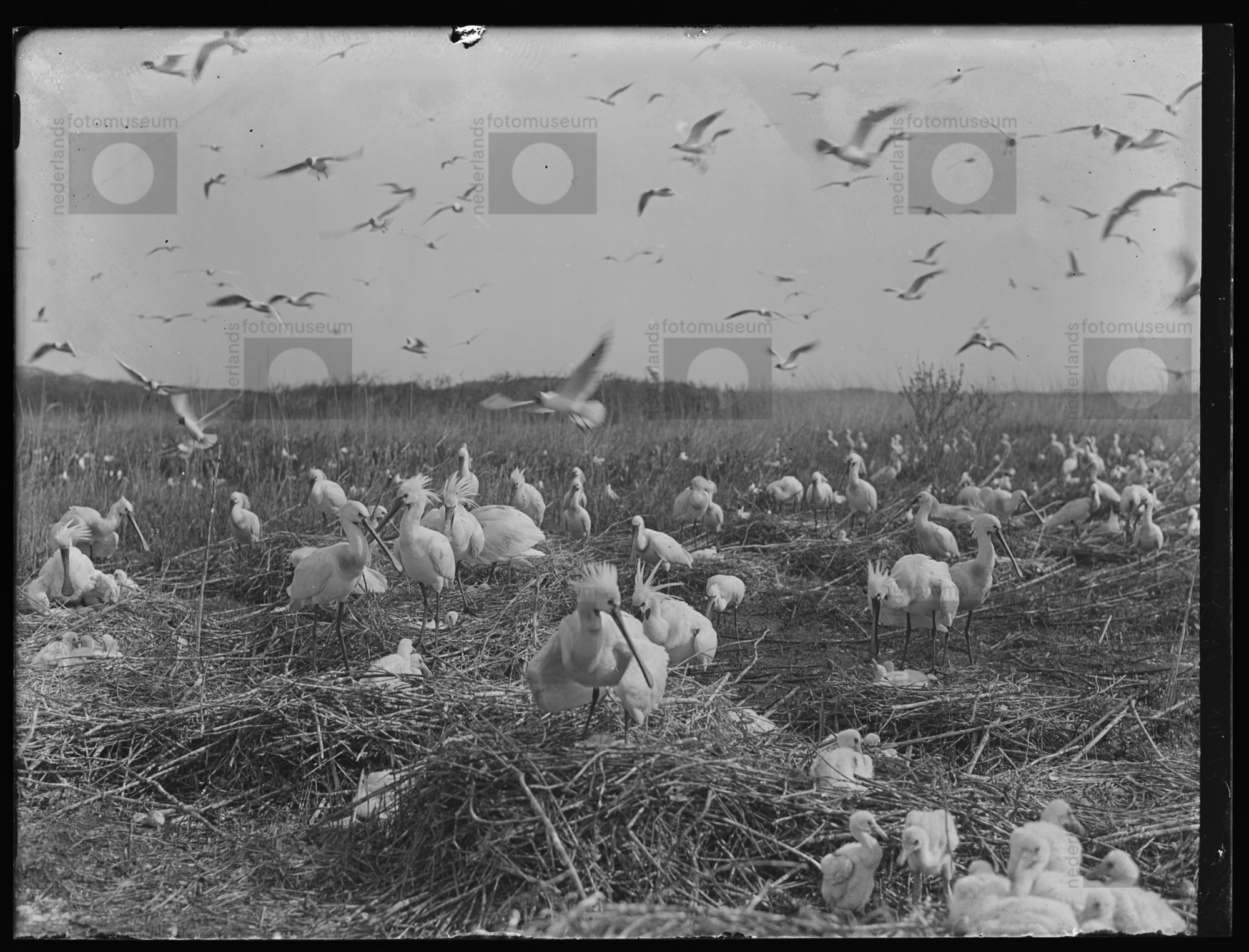 Stormmeeuw op boomnest met jongen, Bergen (1934)