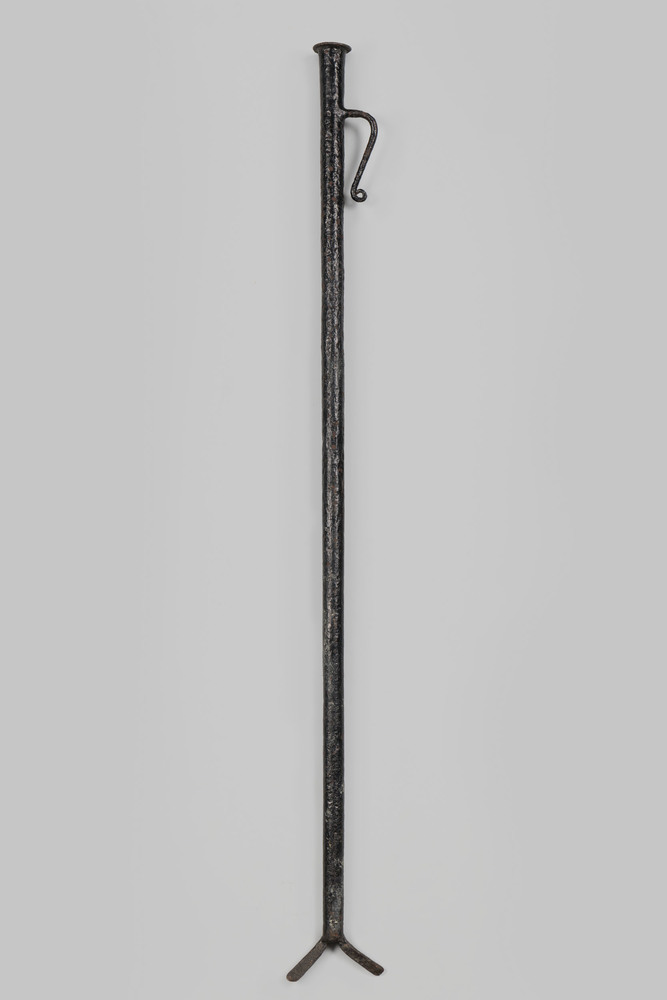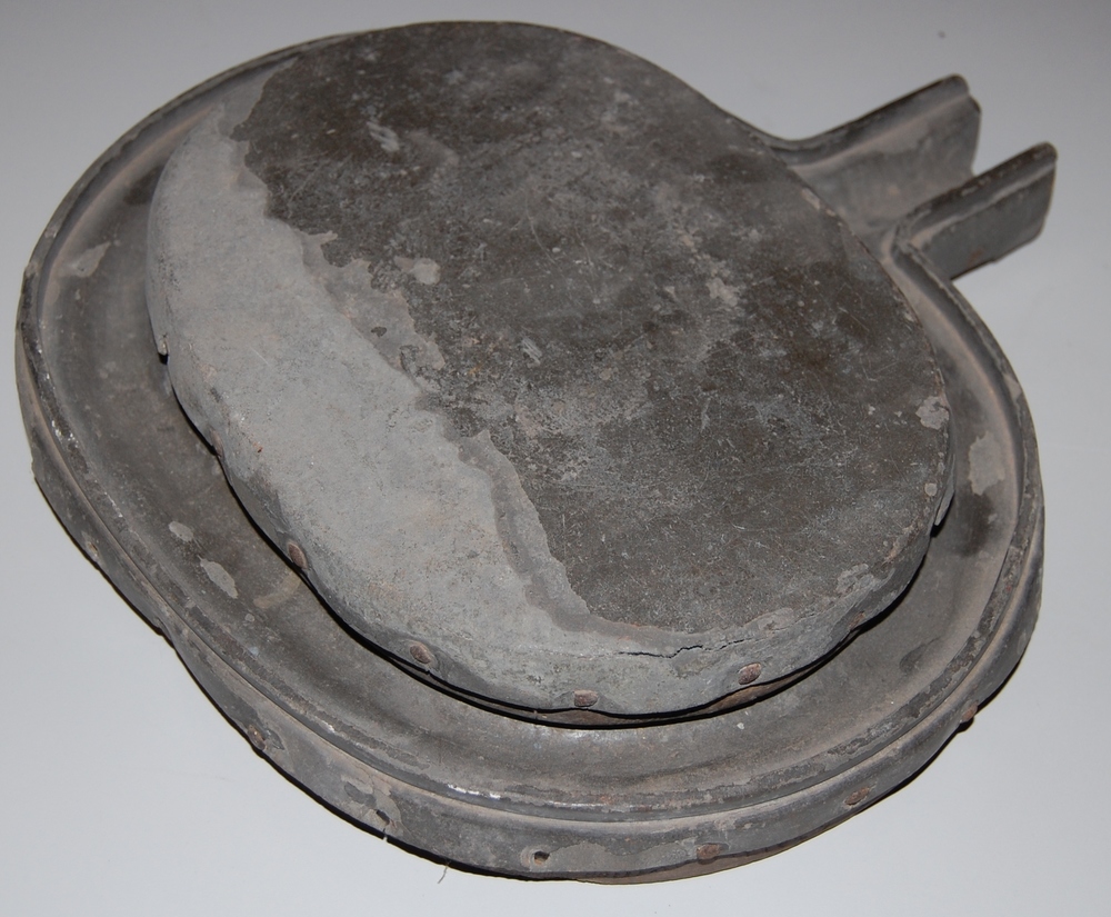gietmal. Ovaal stuk hout bekleed met ijzer en gietlo...