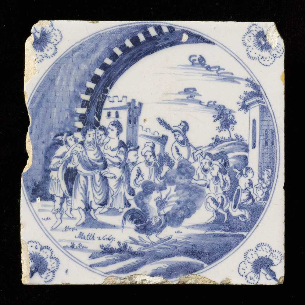 Tegel van keramiek met tinglazuur, voorstellende: ke...