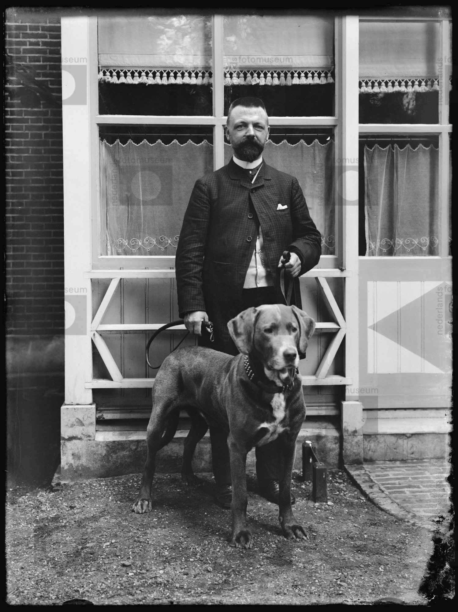 C. van 't Hof met hond Turk in zijn tuin, Bloeme...