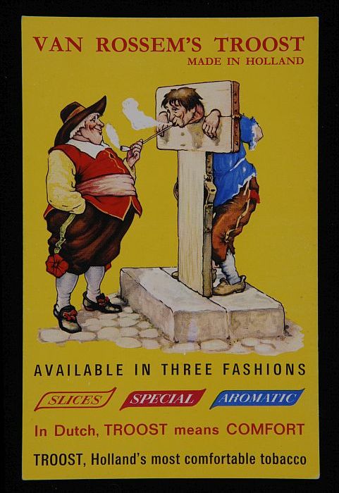 Reclamebord met man aan schandpaal met "van Rossem´s...