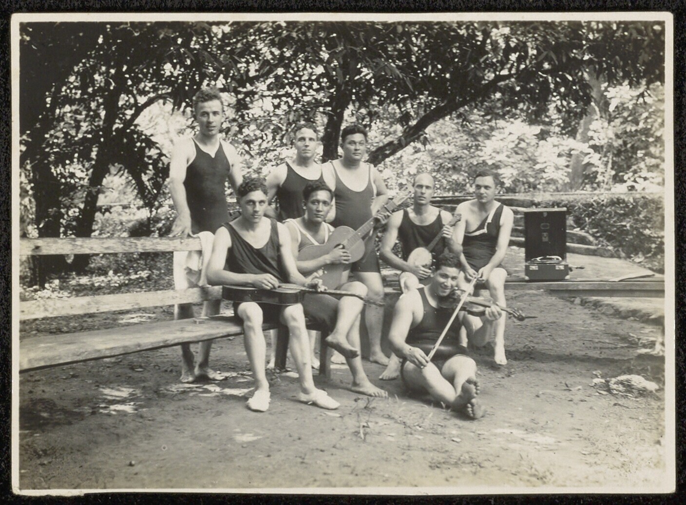 Portret van mannen in zwemkleding met muziekinstrume...