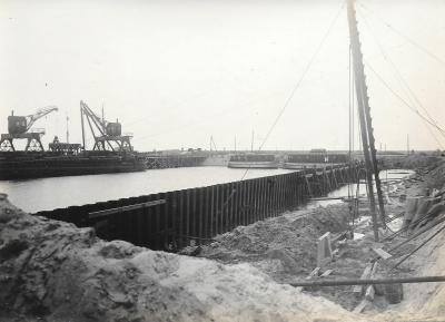 Bouw schutsluizen in de Afsluitdijk bij Kornwerderza...