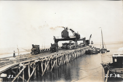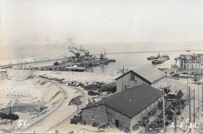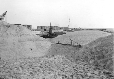 Bouw van de Afsluitdijk. Haventje met enkele schepen...