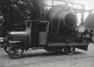 Vrachtwagen met een betonmolen die voor de aanleg va...