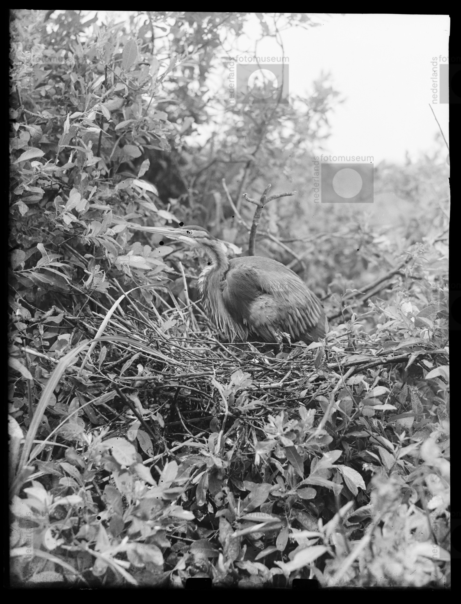 Purperreiger op nest met jongen, Naardermeer (1944)