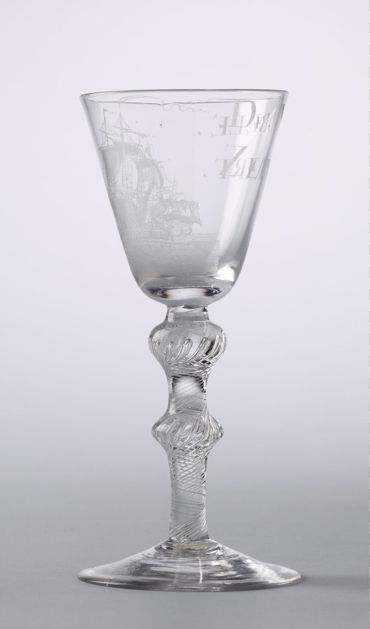 Kelkglas met gegraveerde afbeelding van twee driemas...