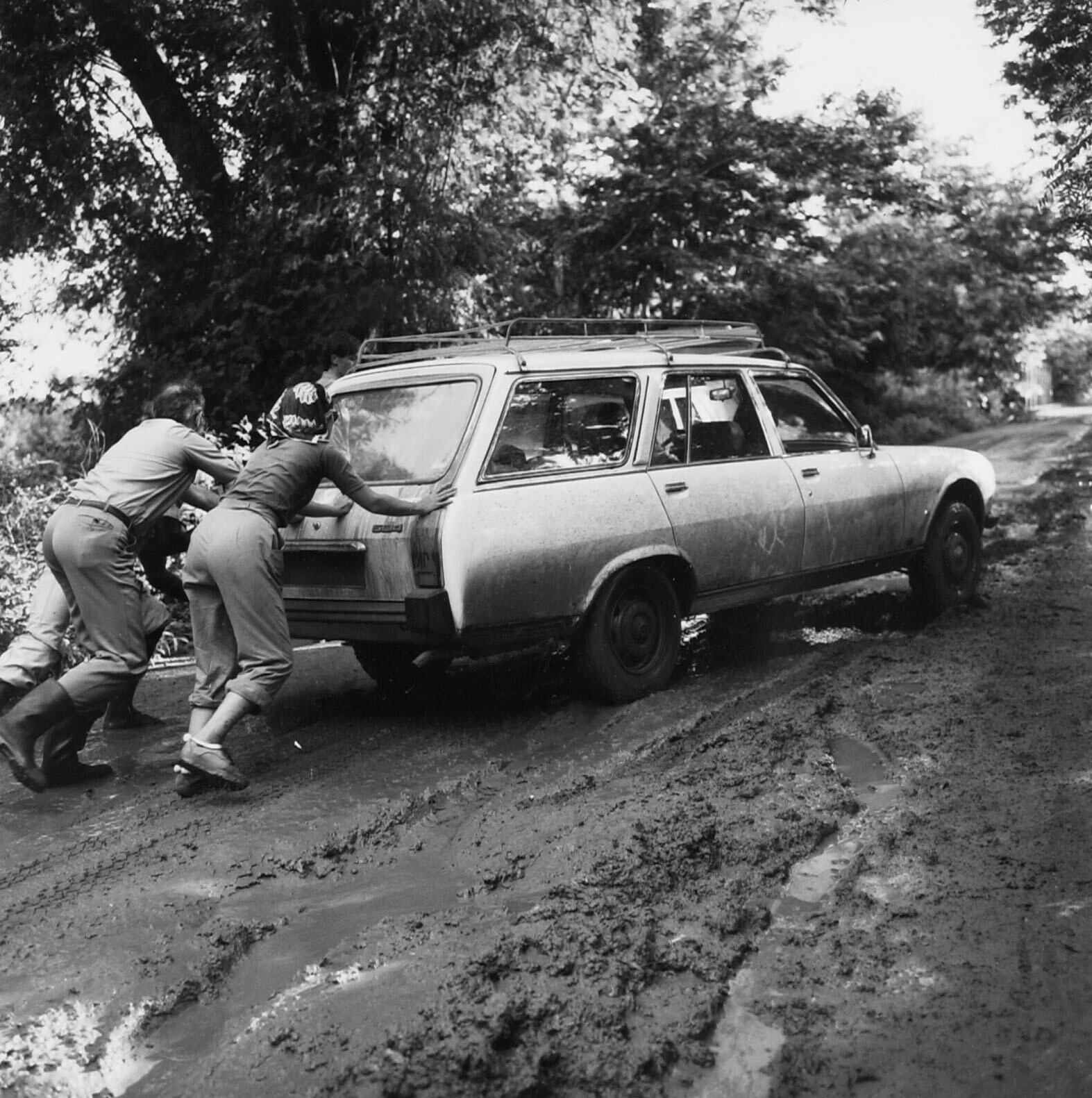 Een vrachtwagen op zijn kant, door aanhoudende regen...