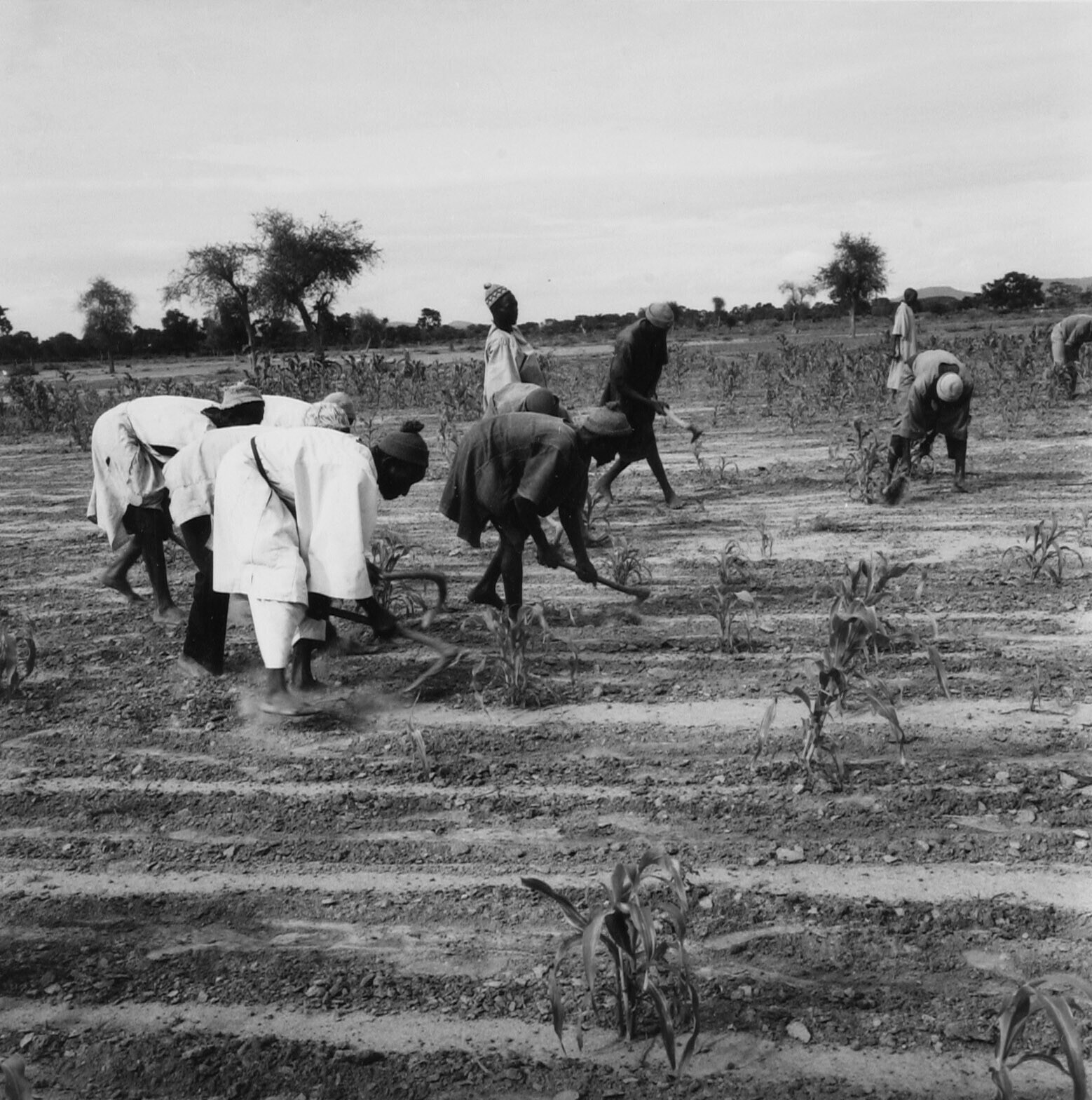 Tussen de plantrijen wordt de schoffel getrokken doo...