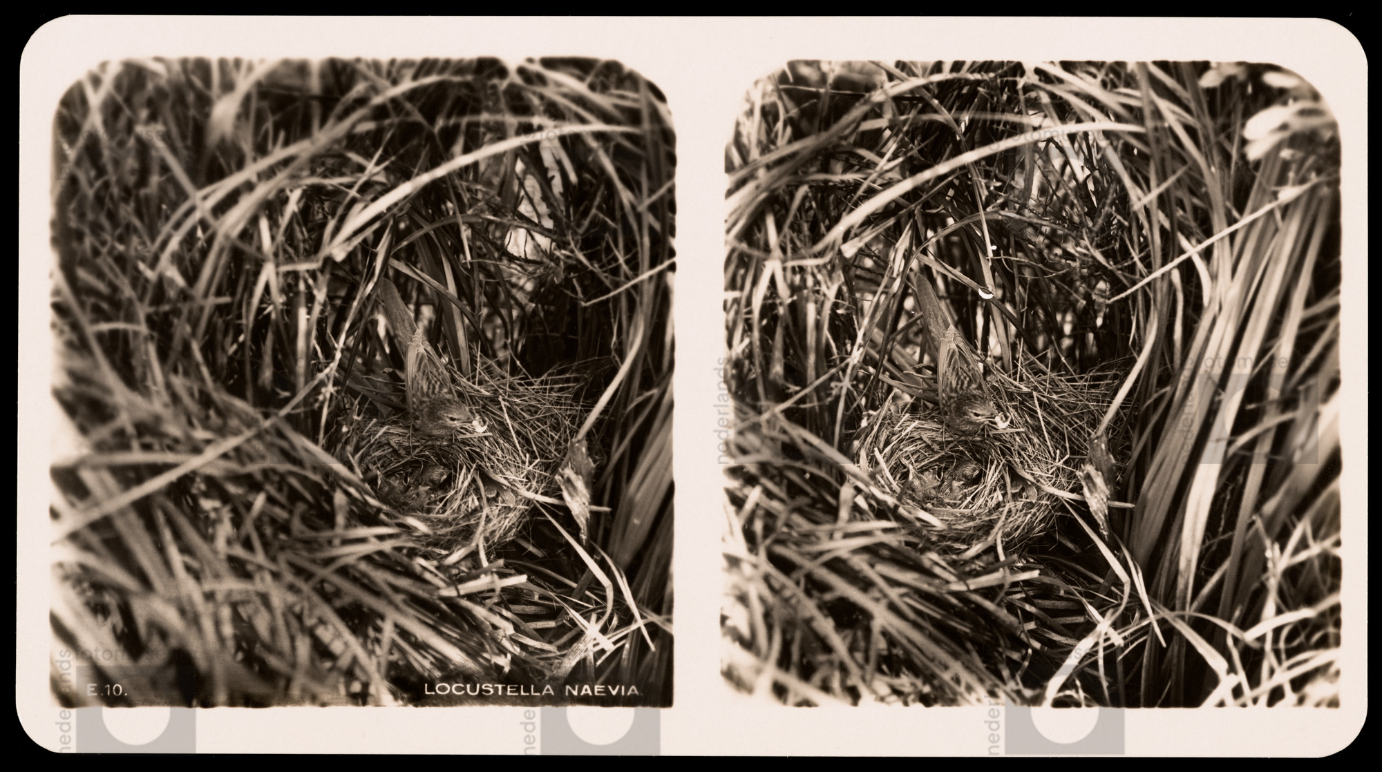 Sprinkhaanrietzanger bij nest met jongen (ca 1922)