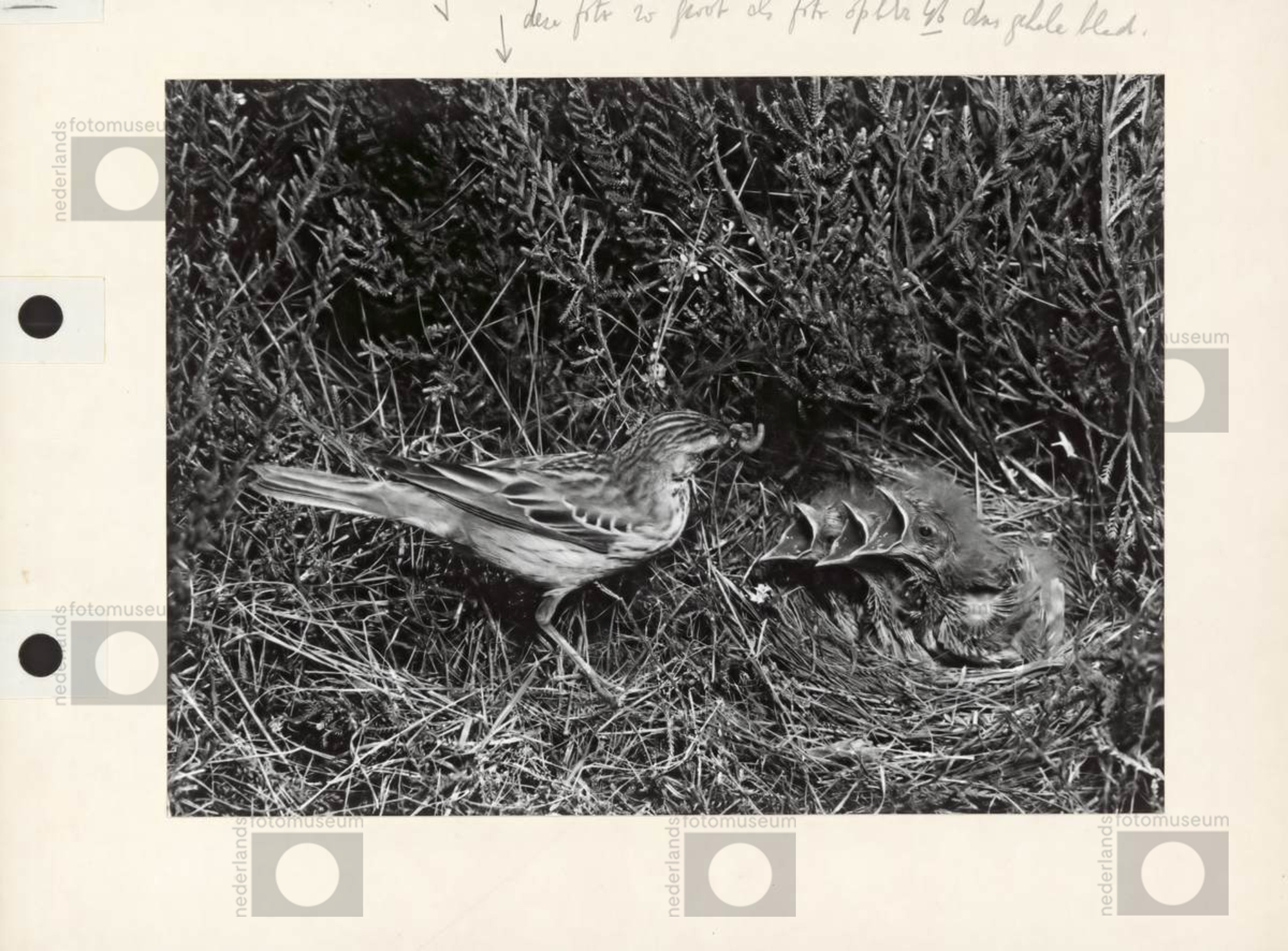 Grondbroedende vogel -Graspieper?- op nest, De Veluw...