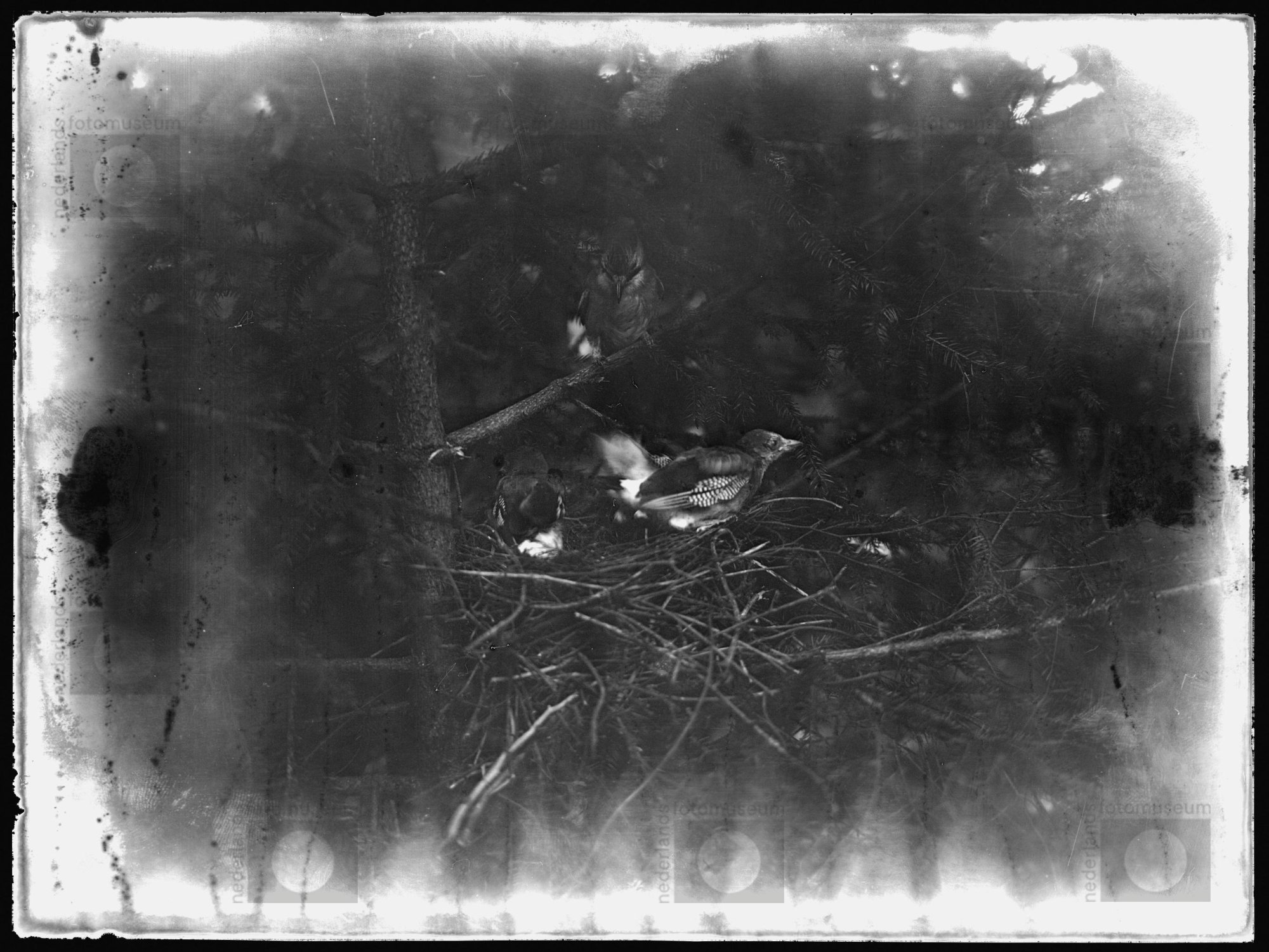 Gaai bij nest met jongen, Ugchelen (1934)
