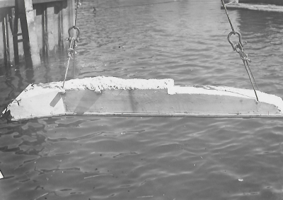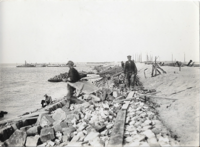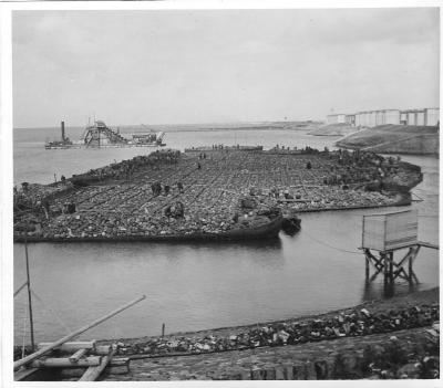 Afsluitdijk. Verzwaren van zinkstukken bij een sluiz...