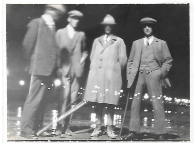 Groepje mannen, blijkbaar bij nachtelijke werkzaamhe...