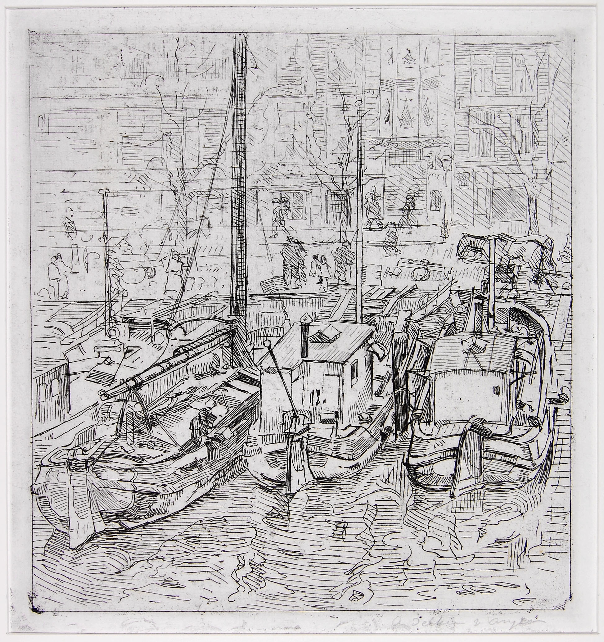 Drie tjalken, afgemeerd in een binnenhaven