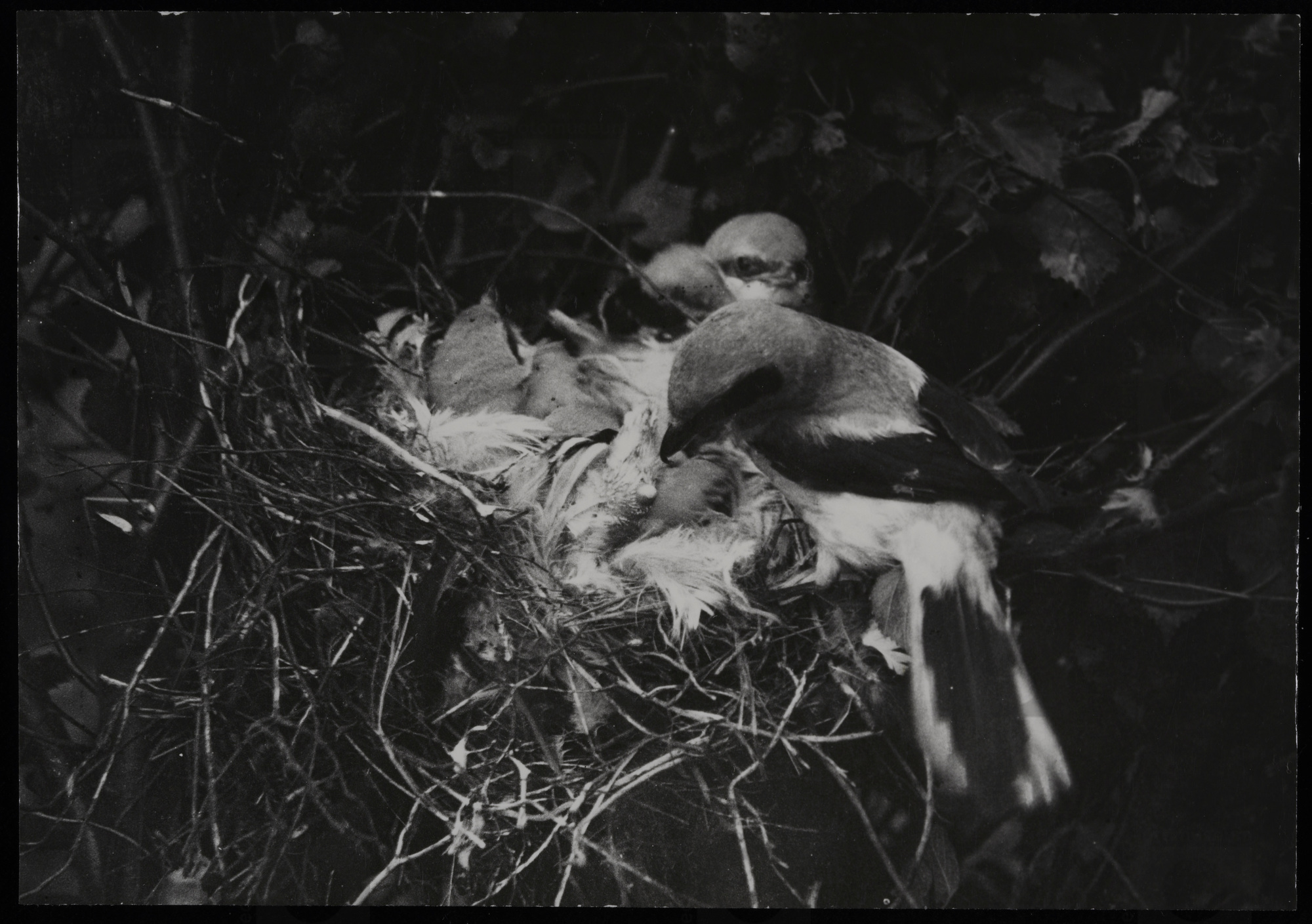Klapekster bij nest met jongen, Astense Peel (1932) ...