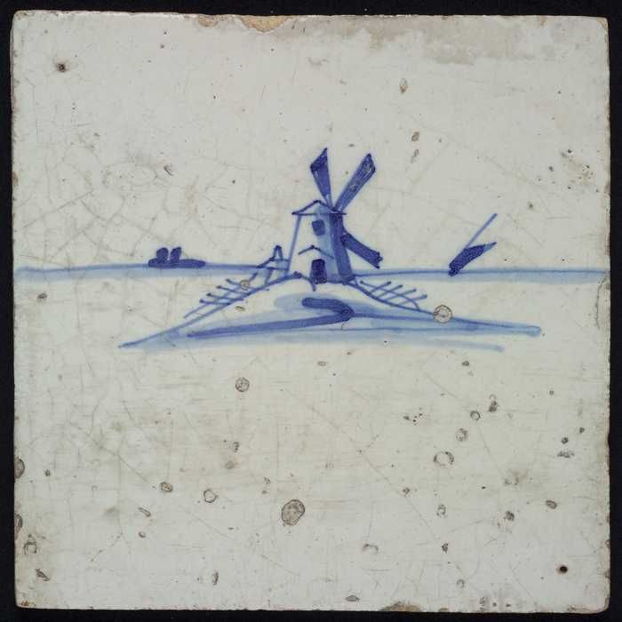 Tafereeltegel, blauw, molen op een terp, geen hoekmo...