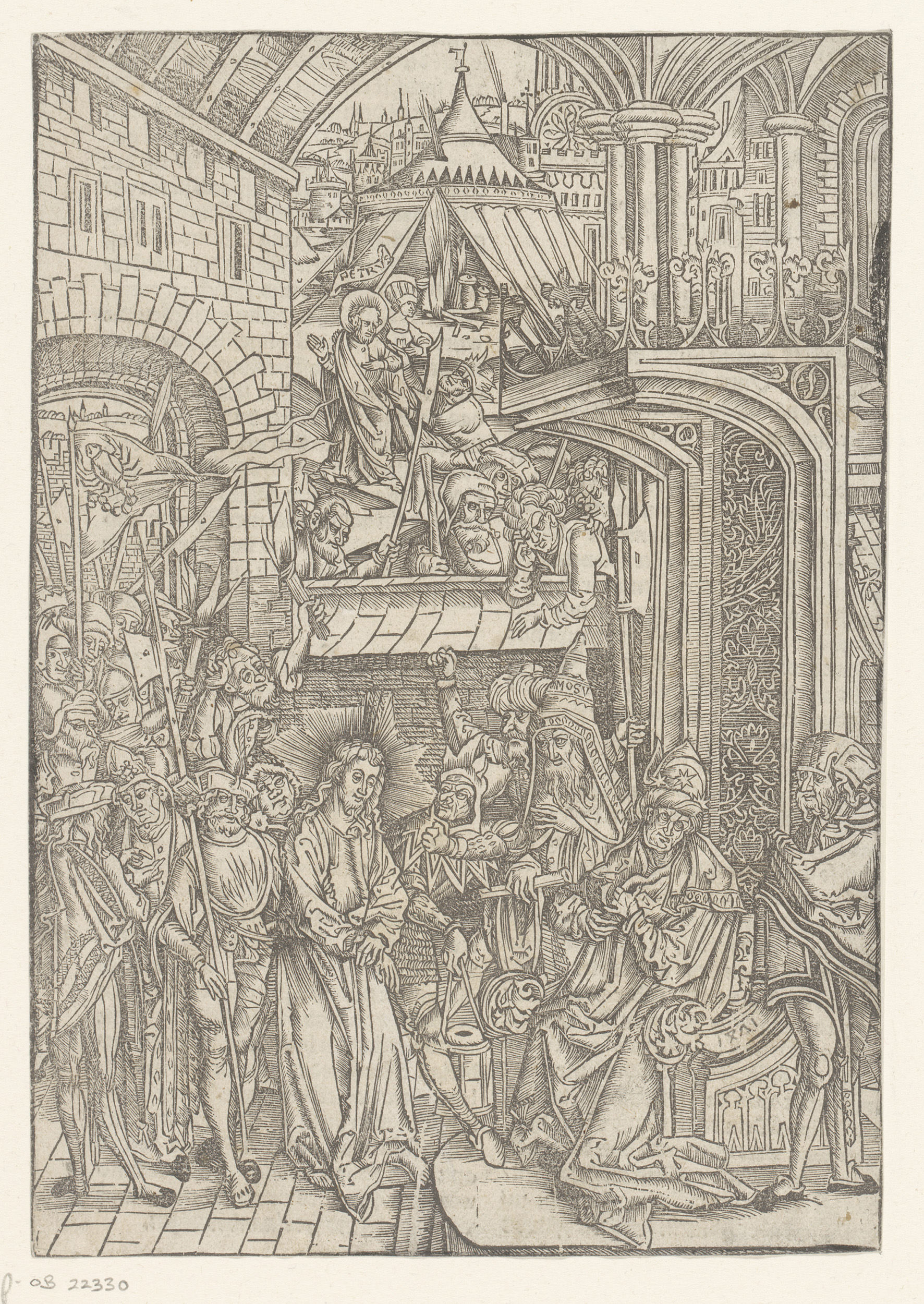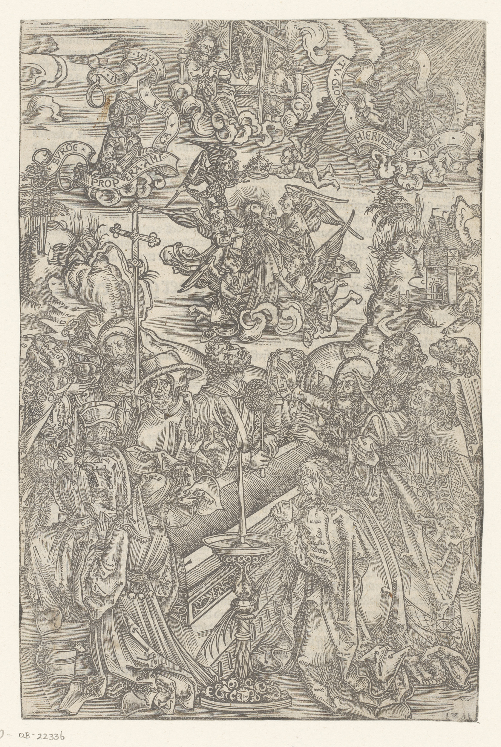 Mannenkwartet: Discantus, Altus, Tenor, Bassus, met nar