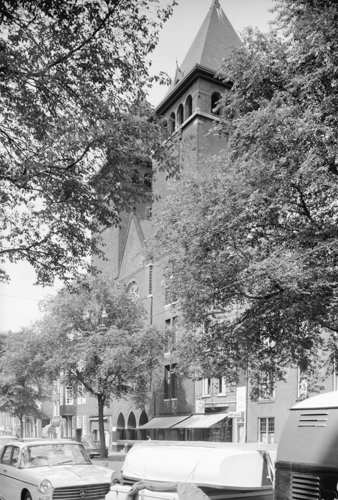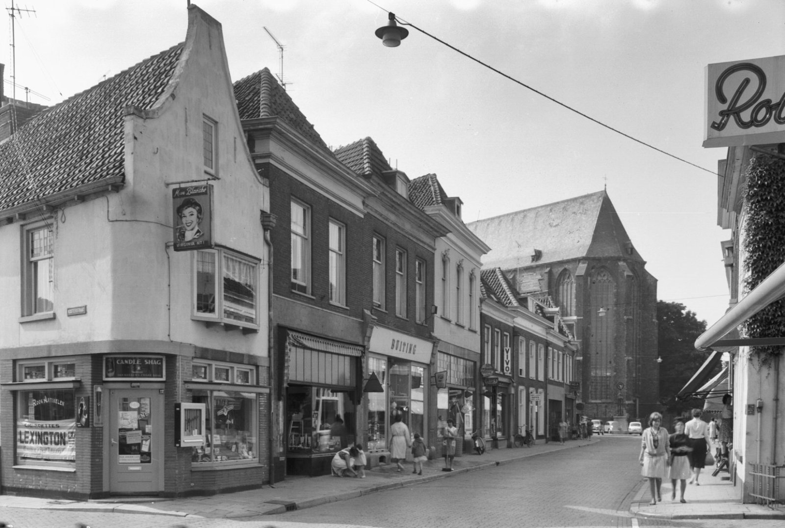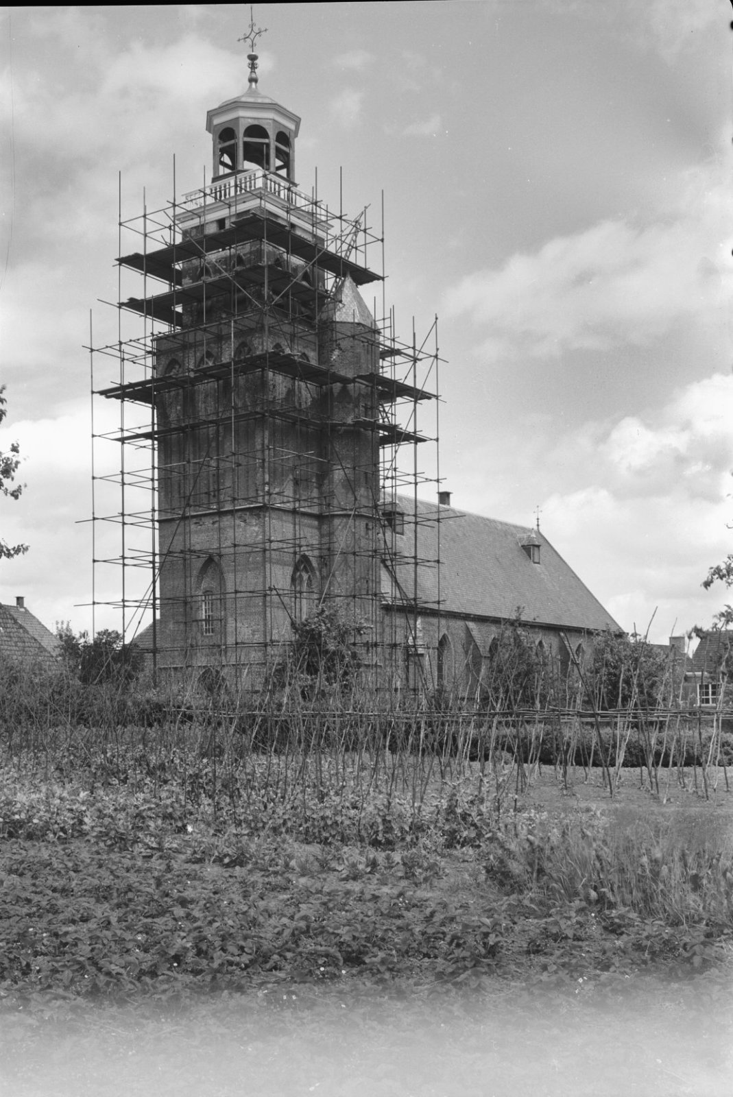 Hervormde kerk met de toren in de steigers vanuit he...