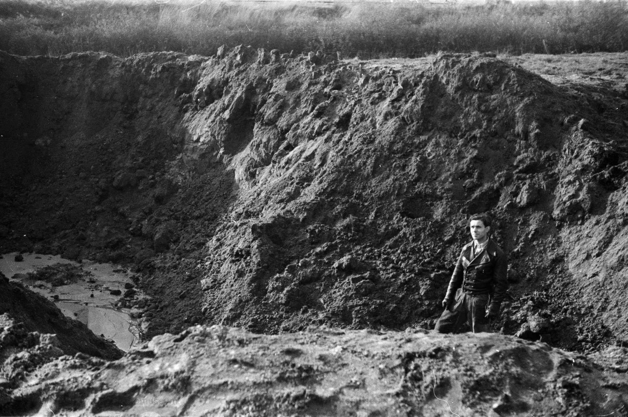 Man in verwoest landschap na de bomaanval op de spoo...