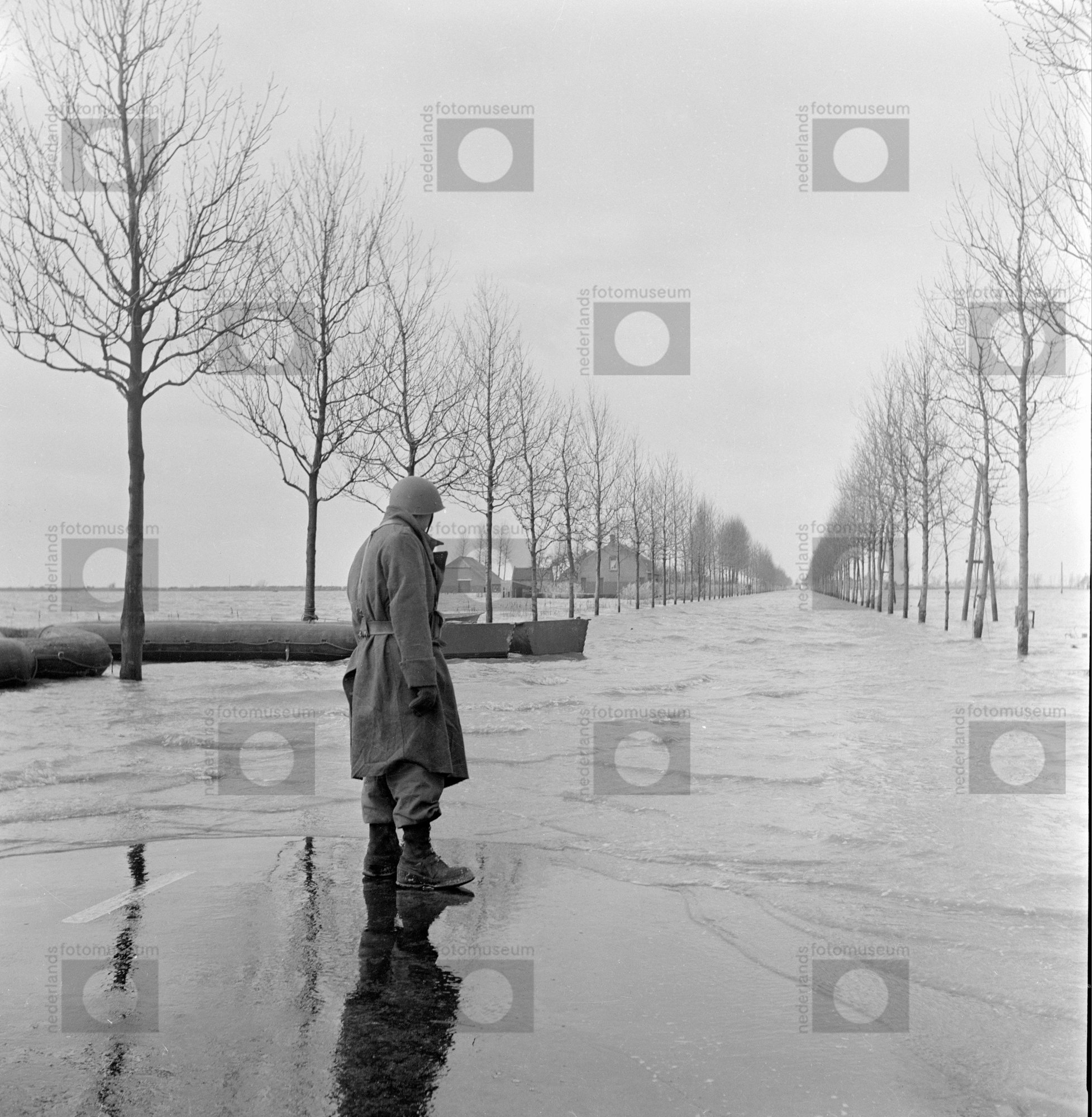 Hulpverlener kijkt uit over overstroomde weg van Hal...
