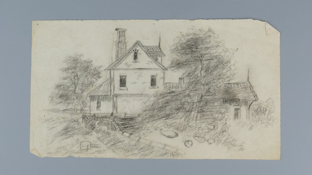 Potloodtekening, voorstellende huis met doorlaat, ca...