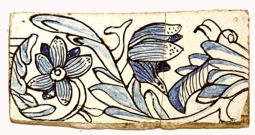 Ornamenttegel. Mangaan bloem motief in kwadraat.