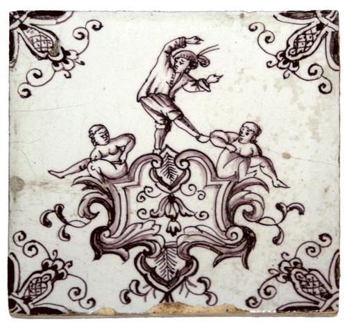 Ornamenttegel, Mangaan acrobaatje met twee naakte fi...