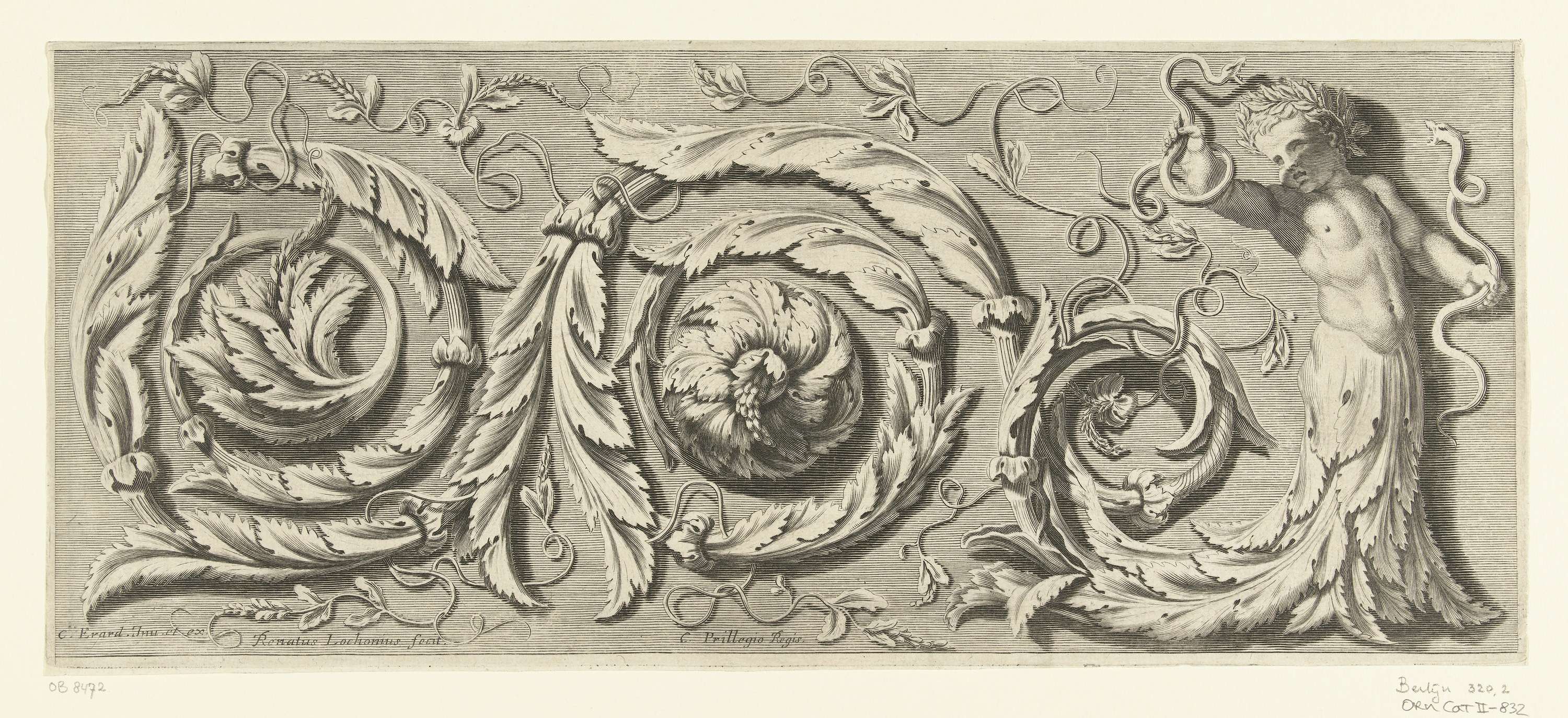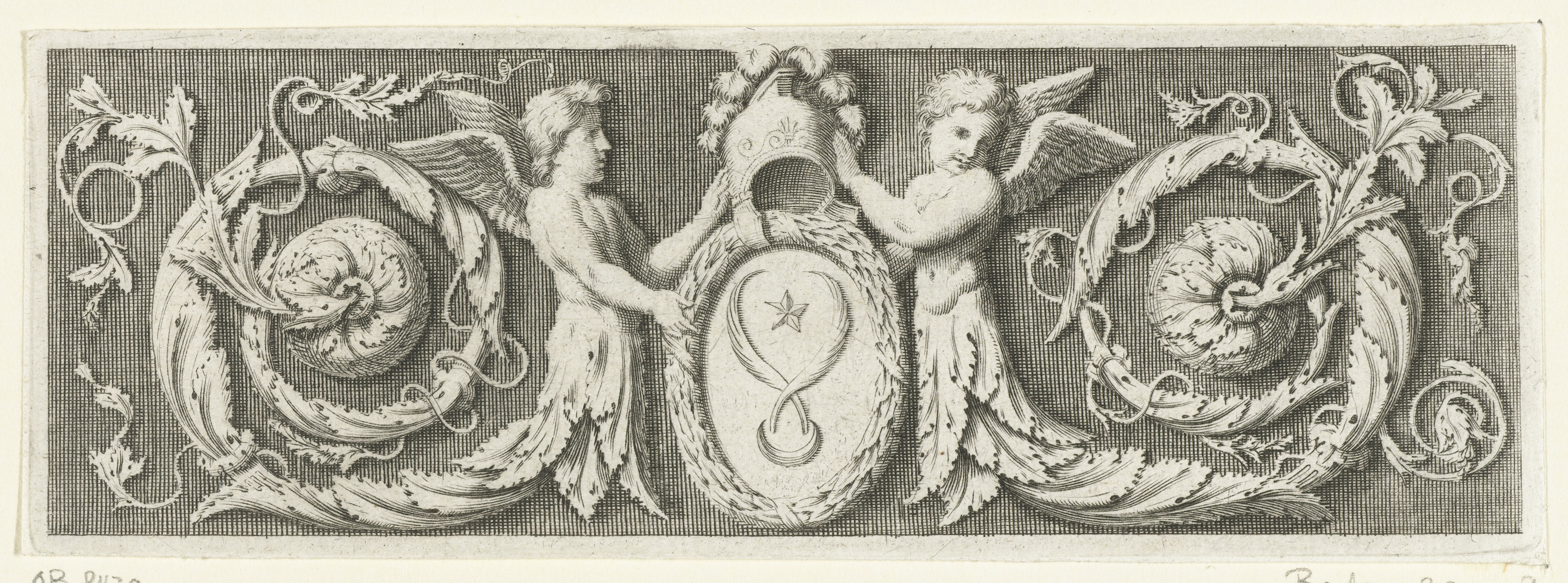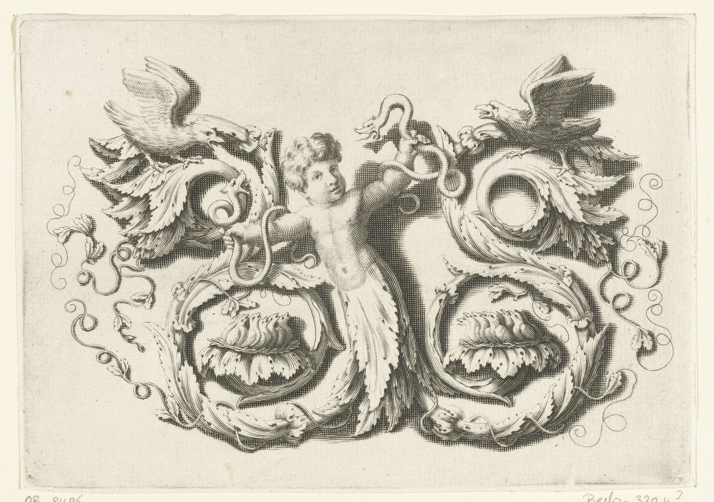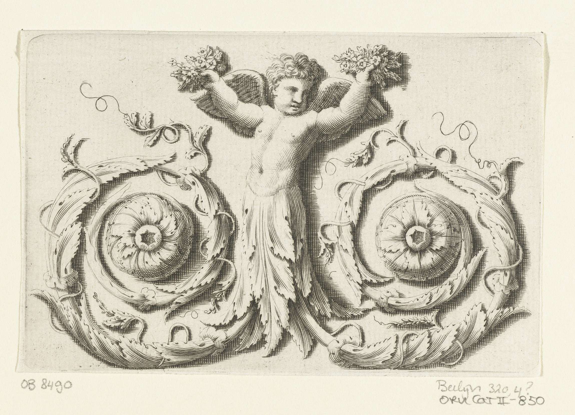 Putto met twee boeketten en onderlijf van bladranken