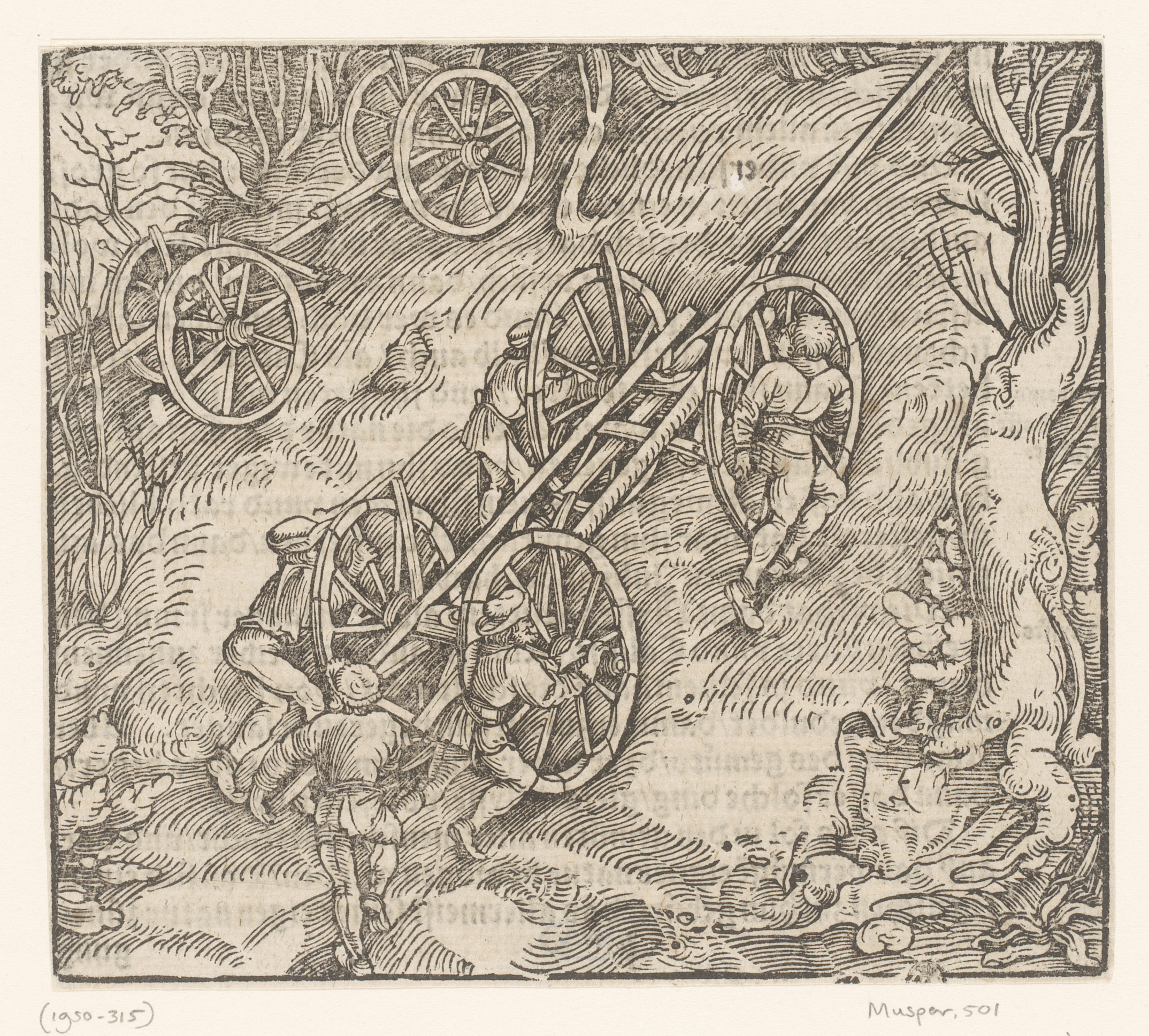 Vijf mannen duwen een kar een heuvel op