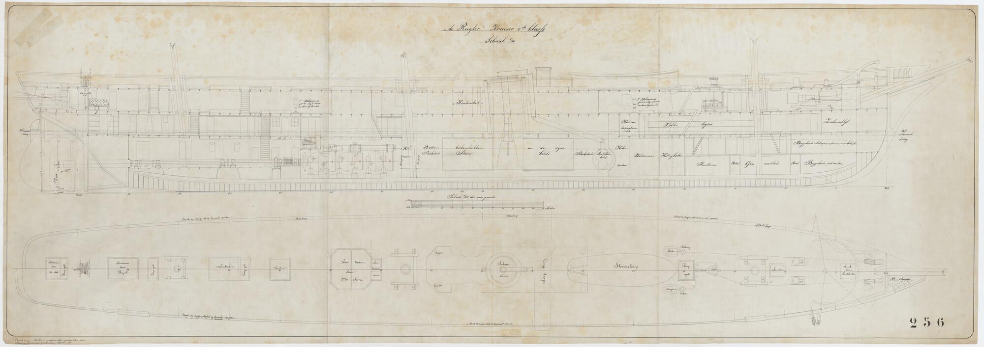 Langsdoorsnede, inwendige verdeling, grootspant van ...
