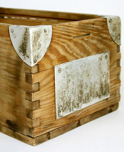 Langwerpige vurenhouten kistje met schuifdeksel.